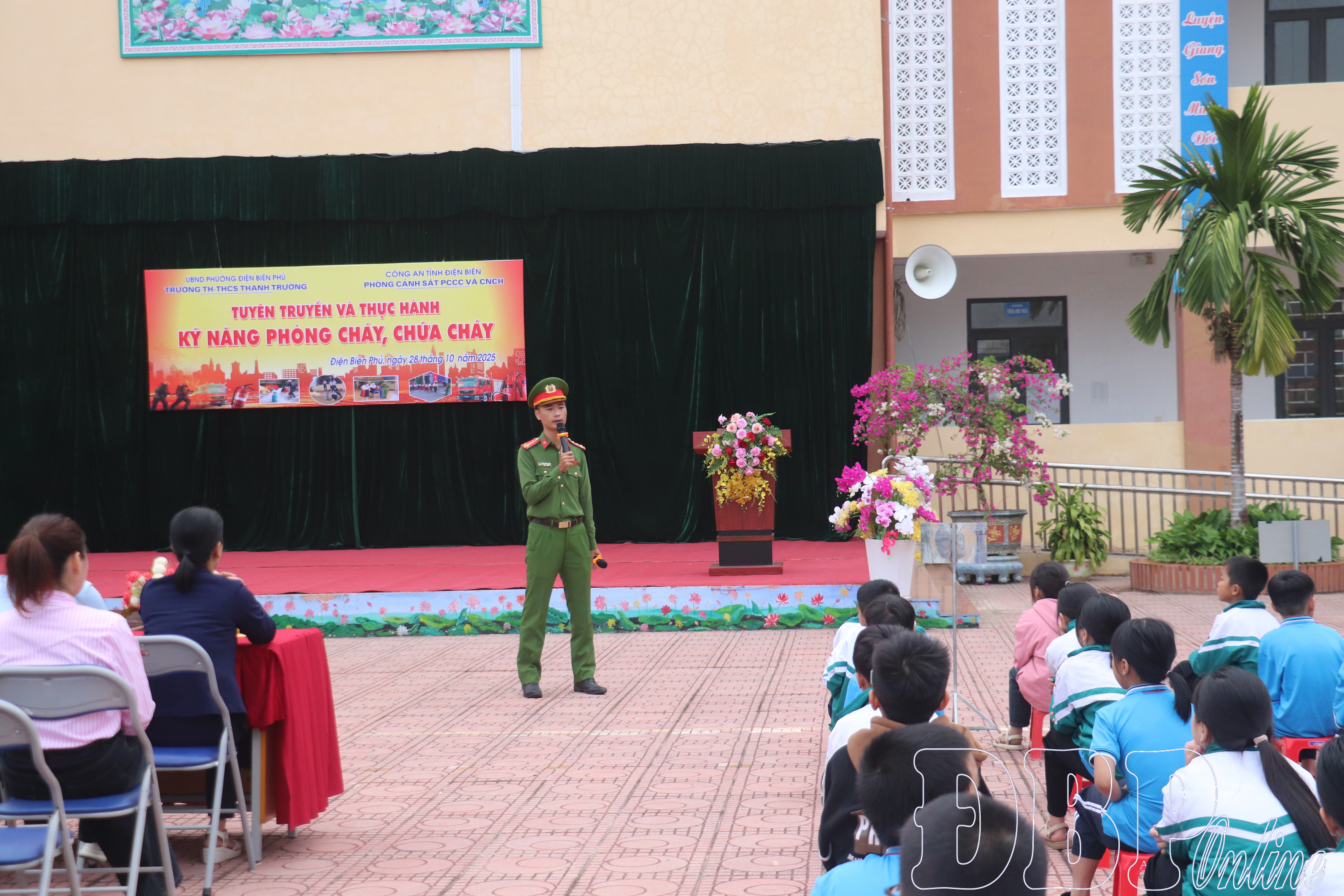 Cán bộ Phòng Cảnh sát Phòng cháy, chữa cháy và Cứu nạn, cứu hộ tuyên truyền về nguyên nhân, hậu quả của cháy nổ tại Trường Tiểu học và THCS Thanh Trường.