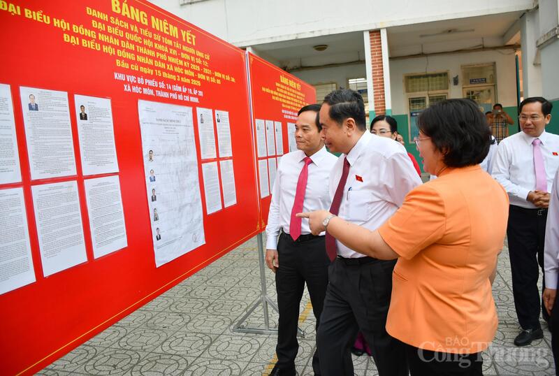 Chủ tịch Quốc hội Trần Thanh Mẫn, Bí thư Thành ủy TP. Hồ Chí Minh Trần Lưu Quang đến dự lễ khai mạc ngày bầu cử Đại biểu Quốc hội khóa XVI và đại biểu Hội đồng nhân dân các cấp nhiệm kỳ 2026 - 2031 tại Khu vực bỏ phiếu số 14 (Trường THCS Đỗ Văn Dậy, xã Hóc Môn, TP. Hồ Chí Minh), Ảnh: Thanh Minh