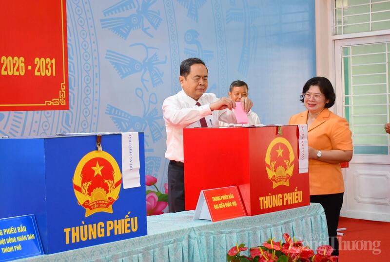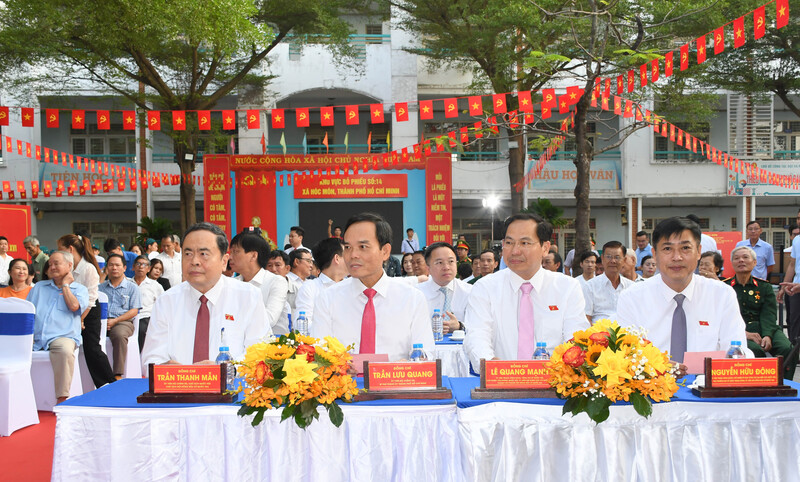 Chủ tịch Quốc hội Trần Thanh Mẫn và Bí thư Thành ủy TP. Hồ Chí Minh Trần Lưu Quang dự lễ khai mạc ngày bầu cử Đại biểu Quốc hội khóa XVI và đại biểu Hội đồng nhân dân các cấp nhiệm kỳ 2026 - 2031 tại Khu vực bỏ phiếu số 14 (Trường THCS Đỗ Văn Dậy, xã Hóc Môn, TP. Hồ Chí Minh). Ảnh: Thanh Minh
