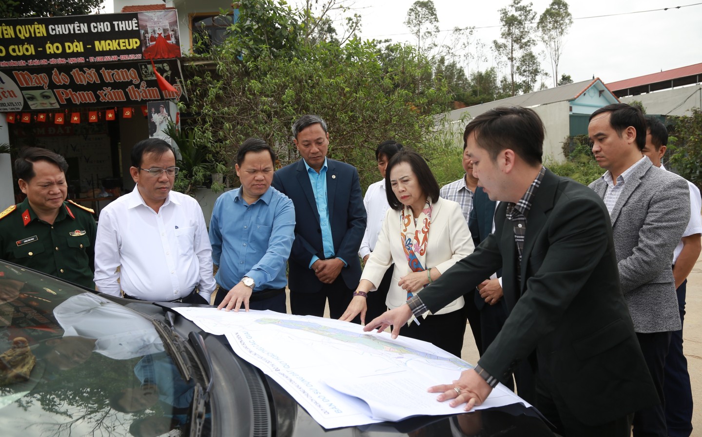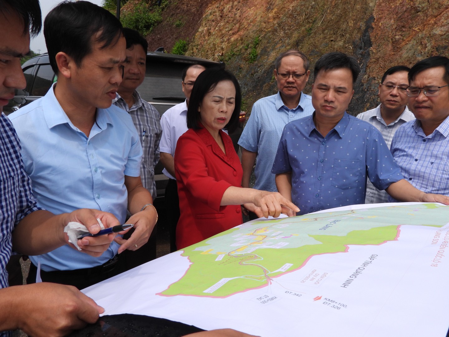 Đồng chí Đoàn Thị Hậu, Phó Bí thư Thường trực Tỉnh ủy, Chủ tịch HĐND tỉnh chỉ đạo phương án giải quyết các vướng mắc ngay tại hiện trường dự án đường giao thông kết nối quốc lộ 4B với quốc lộ 18 huyện Đình Lập (cũ) - Ảnh Công Quân