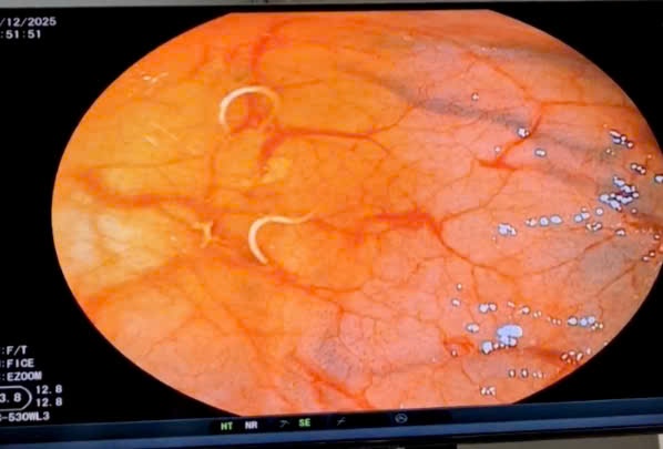 Sau khi khám lâm sàng và đánh giá triệu chứng, bệnh nhân được chỉ định nội soi đại tràng. Trong quá trình thực hiện, ê kíp phẫu thuật của Trung tâm Nội soi Tiêu hóa và Thăm dò chức năng phát hiện nhiều con giun màu trắng ngà, dài khoảng 0,3-0,5 cm, trong lòng đại tràng.