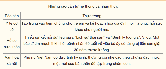 Tuy nhiên, vẫn còn tồn tại những khoảng cách cần được giải quyết. Chi phí y tế do người dân tự chi trả vẫn là gánh nặng tài chính đối với nhiều gia đình - đặc biệt đối với những người dân làm việc tự do, nơi nhiều phụ nữ tập trung trong các công việc thu nhập thấp, thiếu ổn định và đồng thời phải gánh vác nhiều trách nhiệm chăm sóc gia đình nhưng không được trả công. Những yếu tố này có thể khiến phụ nữ trì hoãn hoặc gặp khó khăn khi tiếp cận dịch y tế.