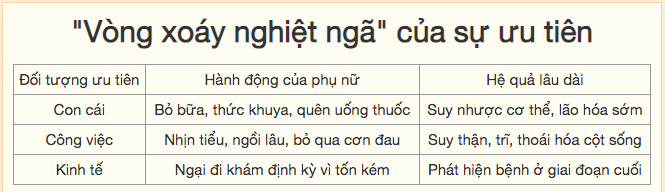 Cuối cùng là gánh nặng bệnh tật mãn tính. Khi các rối loạn sức khỏe (như thiếu máu, suy giáp, sa sàn chậu) không được điều trị sớm do bị coi là "biểu hiện của tuổi tác/giới tính", chúng sẽ chuyển thành bệnh lý mãn tính không thể đảo ngược, góp phần tạo nên số năm sống chung với bệnh tật cao ở phụ nữ.