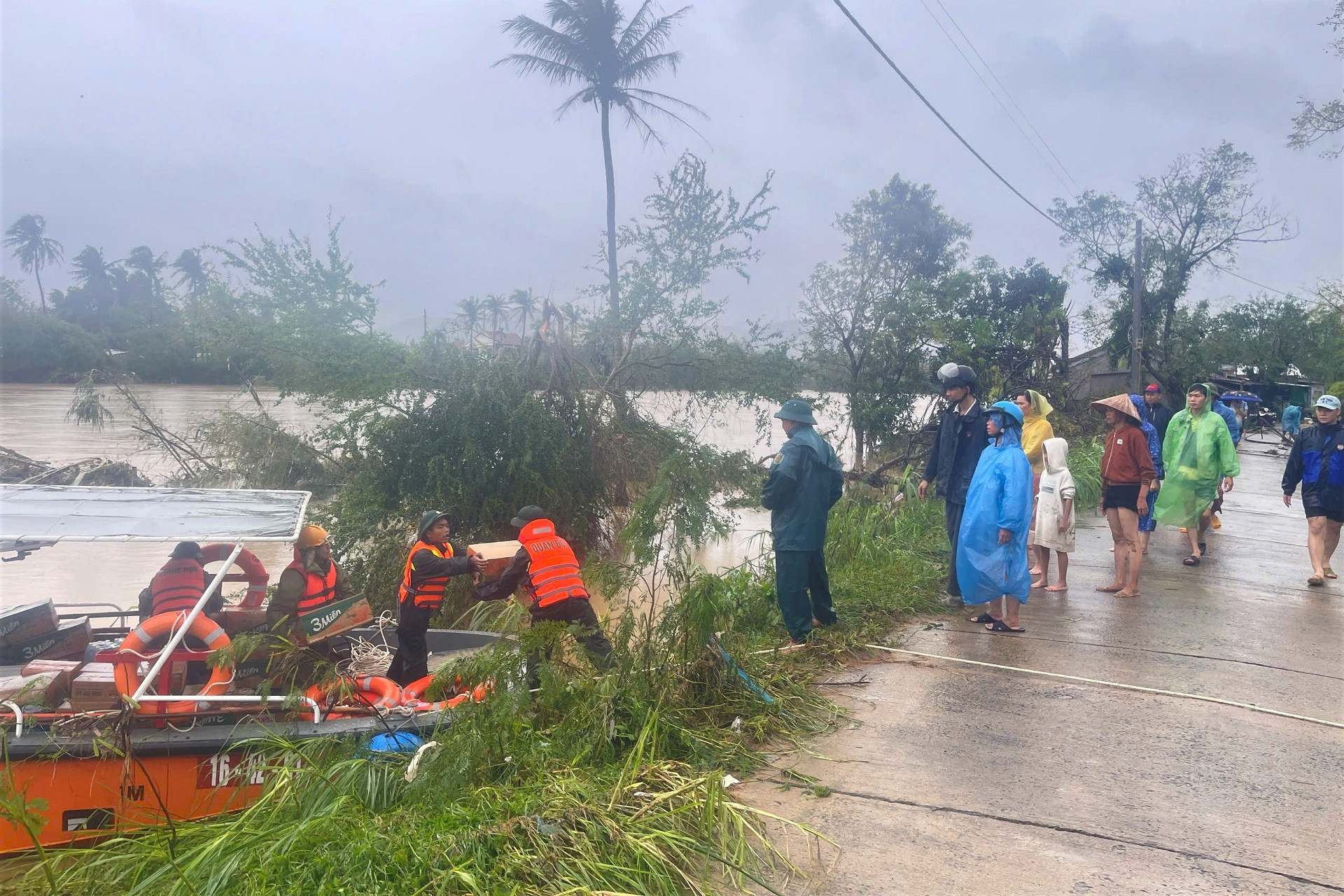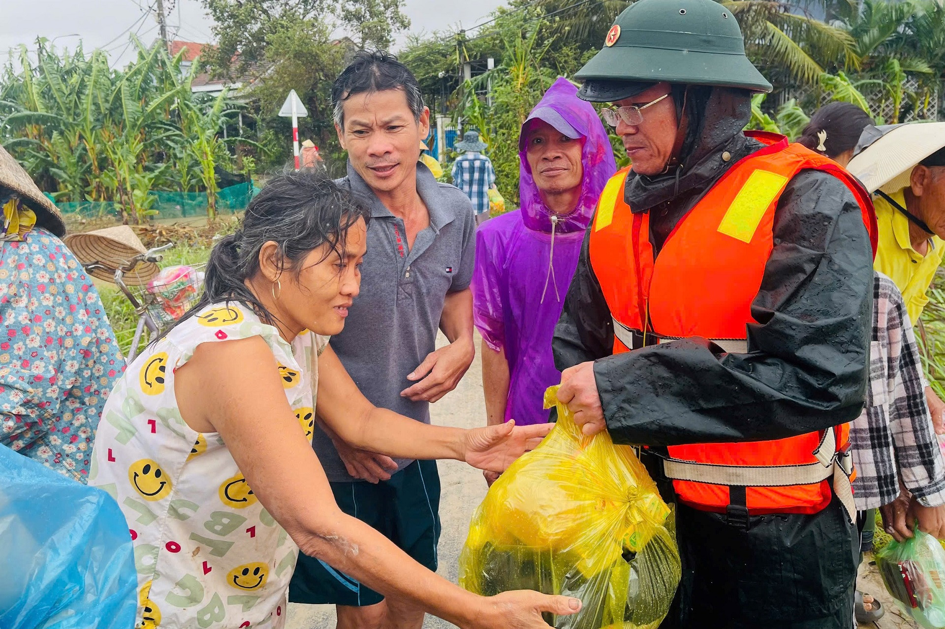 Lực lượng chức năng có mặt kịp thời, hỗ trợ nhu yếu phẩm cho người dân từ những ngày còn ngập sâu. Ảnh: Văn Viễn