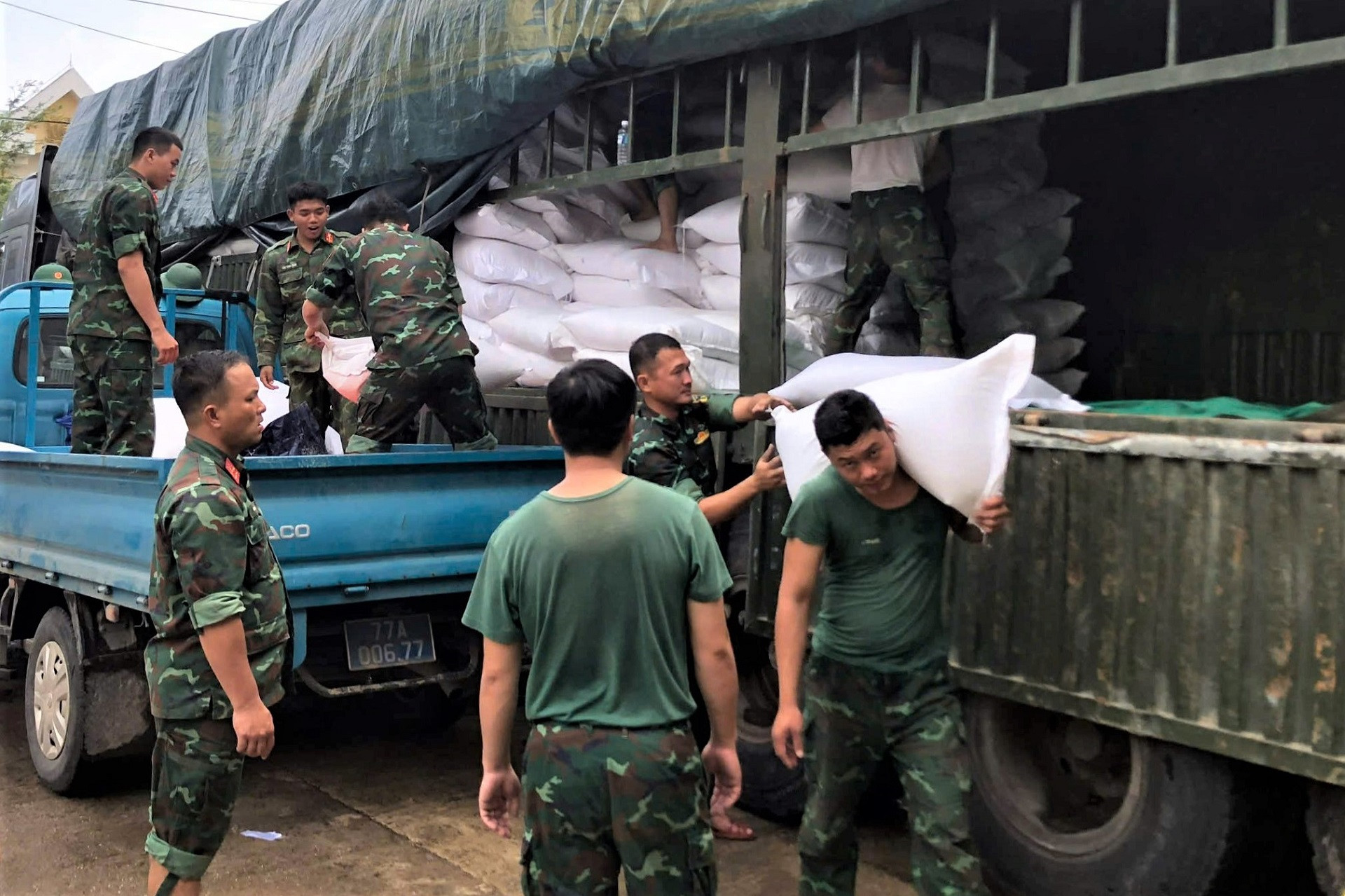 Lữ đoàn 368 (Quân khu 5) phối hợp với UBND phường Quy Nhơn Đông tổ chức vận chuyển và cấp phát gạo hỗ trợ cho các hộ dân bị thiệt hại do bão lũ. Ảnh: Anh Qui
