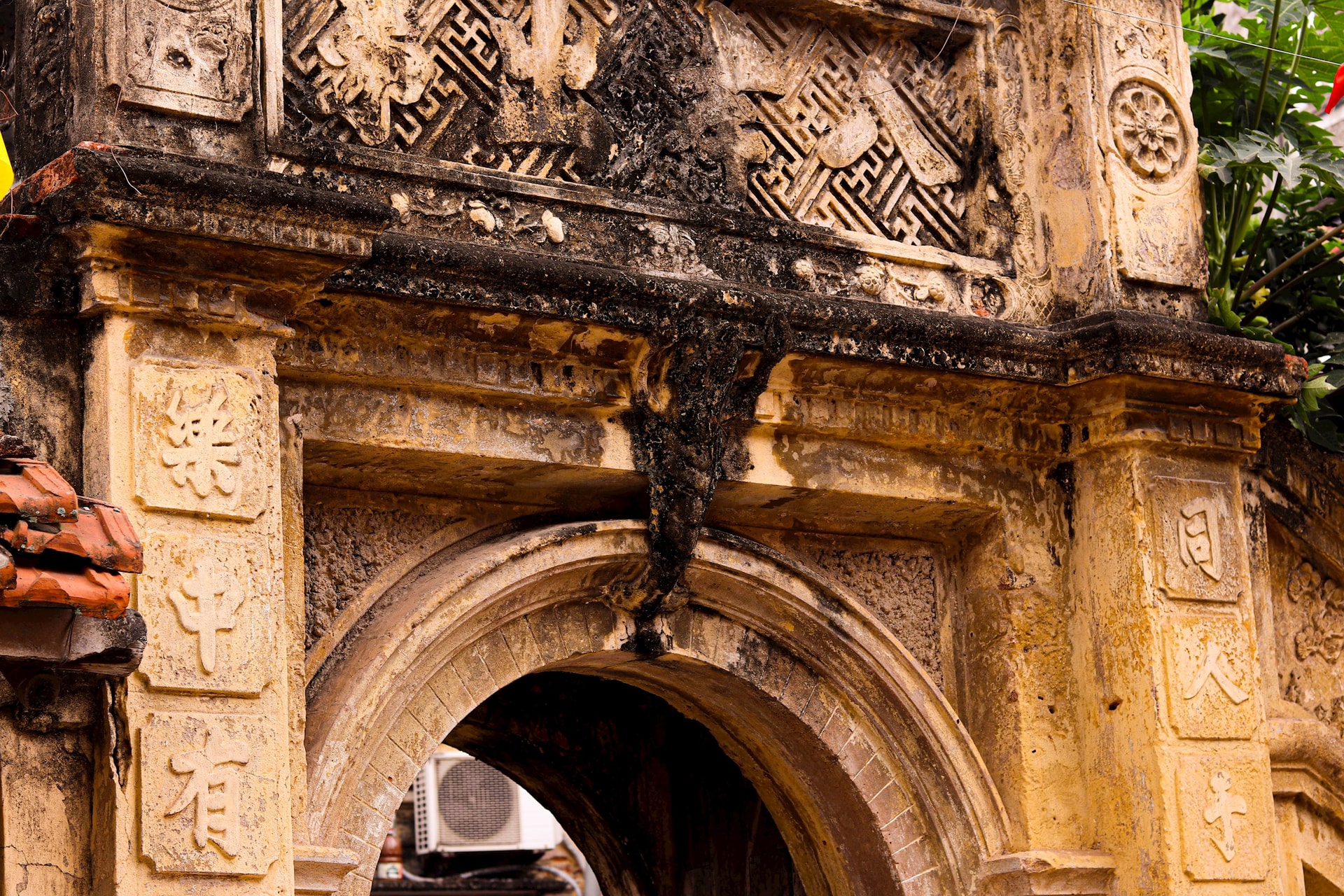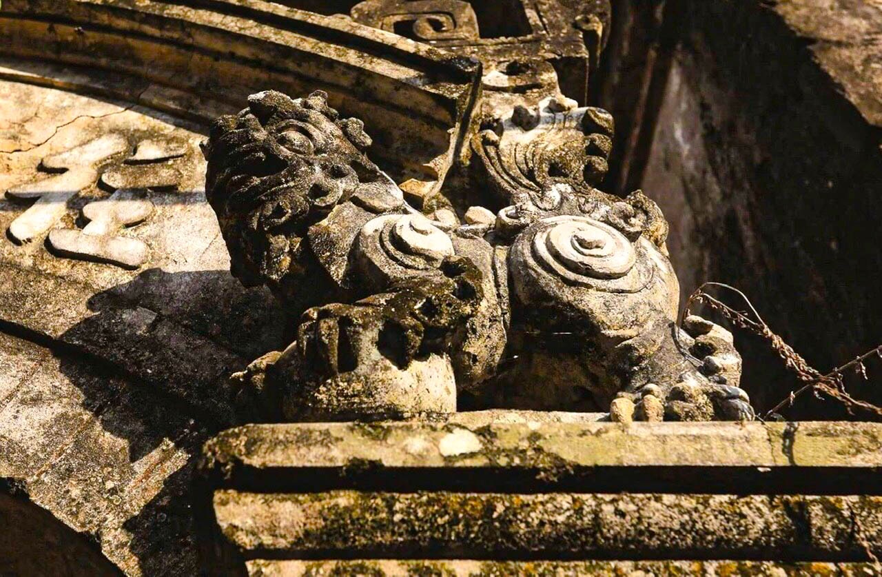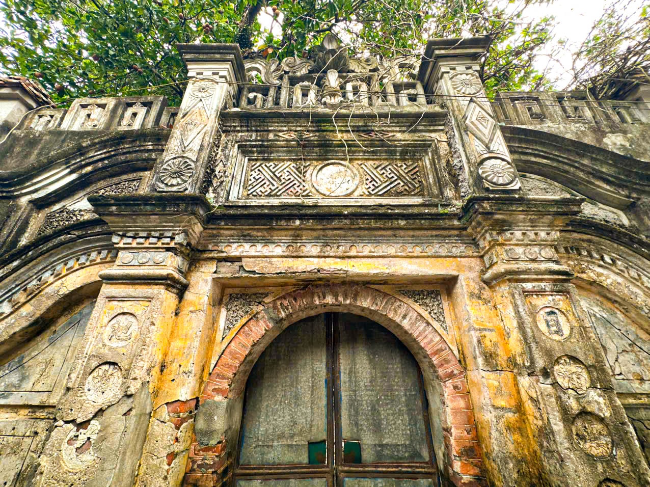 Phần trán tường được biến tấu đầy sáng tạo có hình con tôm đắp nổi, đôi càng to khỏe, cong, hướng lên trên. Vòm cổng làm theo kiến trúc phương Tây nhưng bên cạnh lại là hai hàng câu đối, liễn đối chữ Hán - Nôm trên tấm đại tự truyền thống của người Việt.
