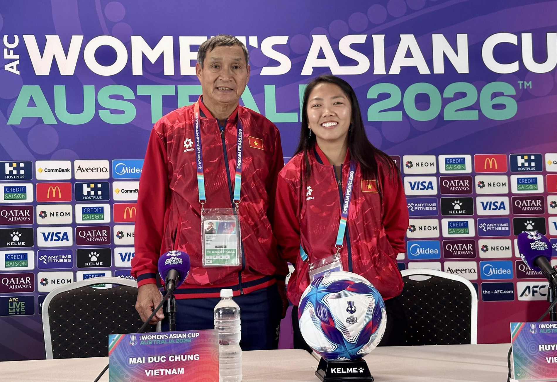 HLV Mai Đức Chung và tiền đạo Huỳnh Như trong buổi họp báo trước trận. Ảnh: VFF