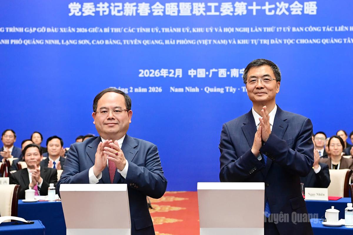Tại chương trình, các Bí thư Tỉnh ủy, Thành ủy, Khu ủy cùng ký kết “Biên bản ghi nhớ Hội nghị Gặp gỡ đầu Xuân năm 2026 giữa Bí thư Tỉnh ủy, Thành ủy các tỉnh, thành phố Quảng Ninh, Lạng Sơn, Cao Bằng, Tuyên Quang (Việt Nam) và Bí thư Khu ủy Khu tự trị dân tộc Choang Quảng Tây (Trung Quốc)”.