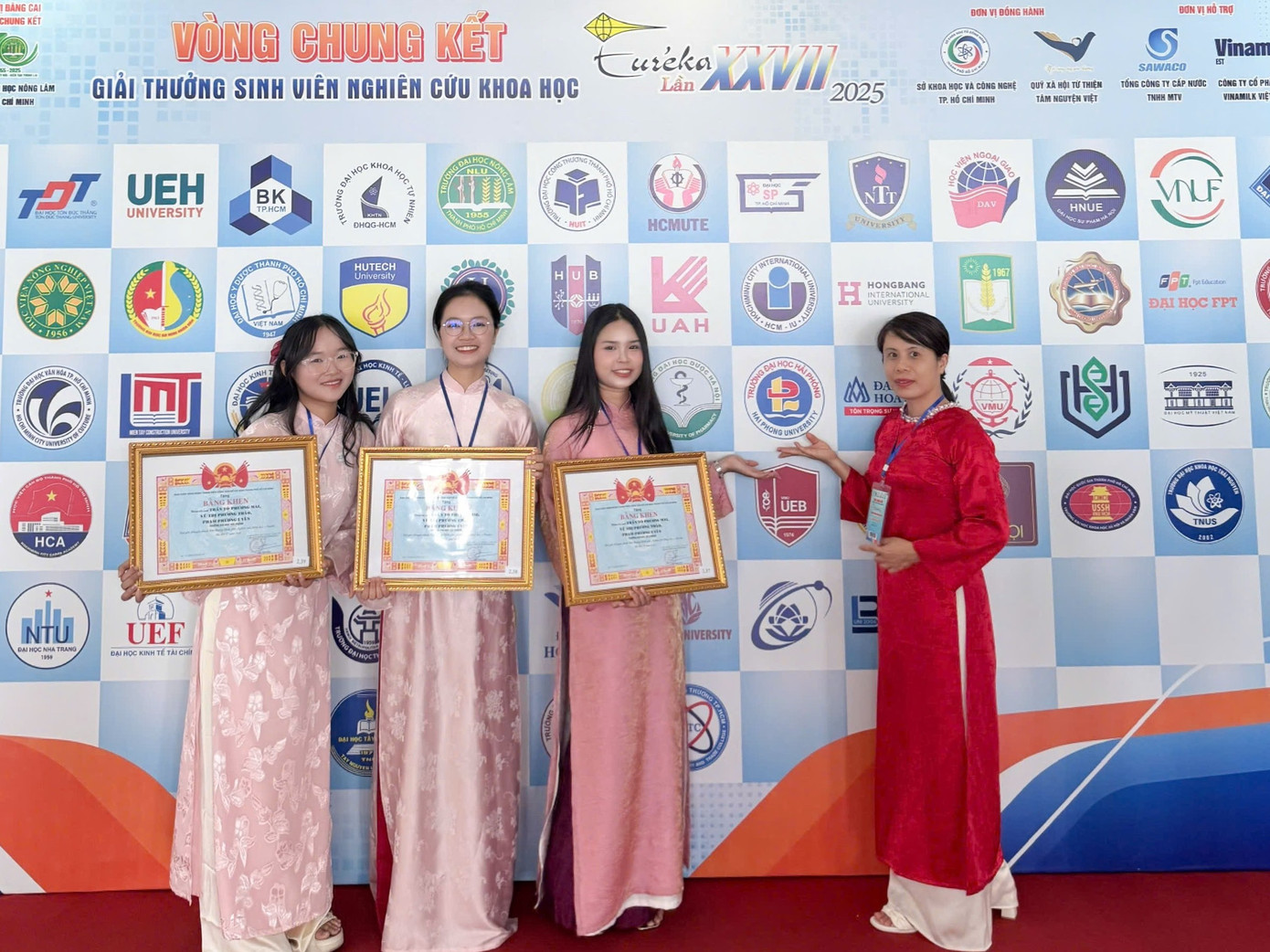 Phương Mai (thứ 3 từ trái qua) cùng giảng viên hướng dẫn và các thành viên nhóm nghiên cứu tại Vòng Chung kết Giải thưởng Euréka lần thứ 27, tổ chức tại Trường Đại học Nông Lâm TP. Hồ Chí Minh vào tháng 12/2025.