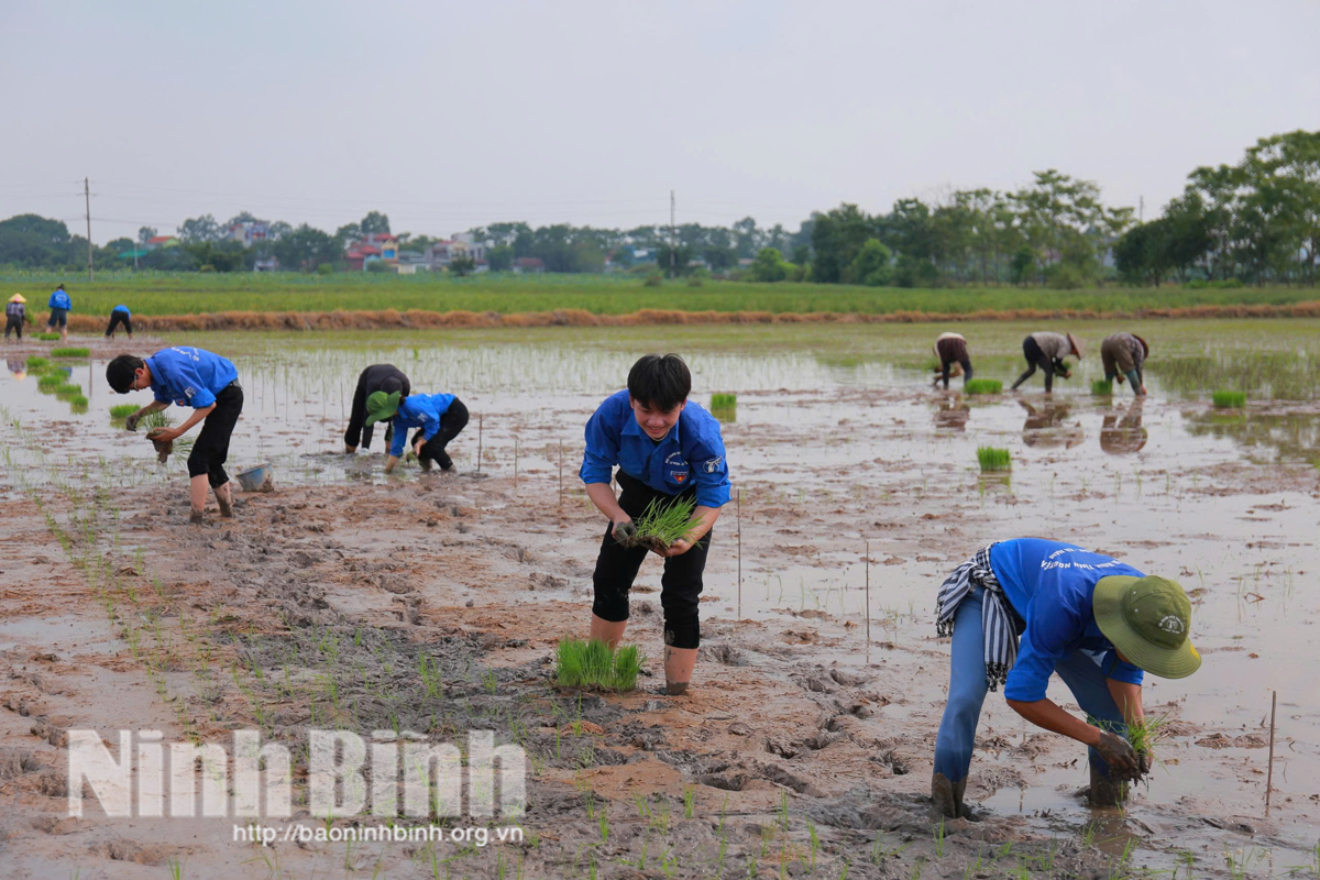 Thành viên CLB Thanh niên tình nguyện Lý Nhân tham gia cấy mạ hỗ trợ các hộ neo đơn trên địa bàn.