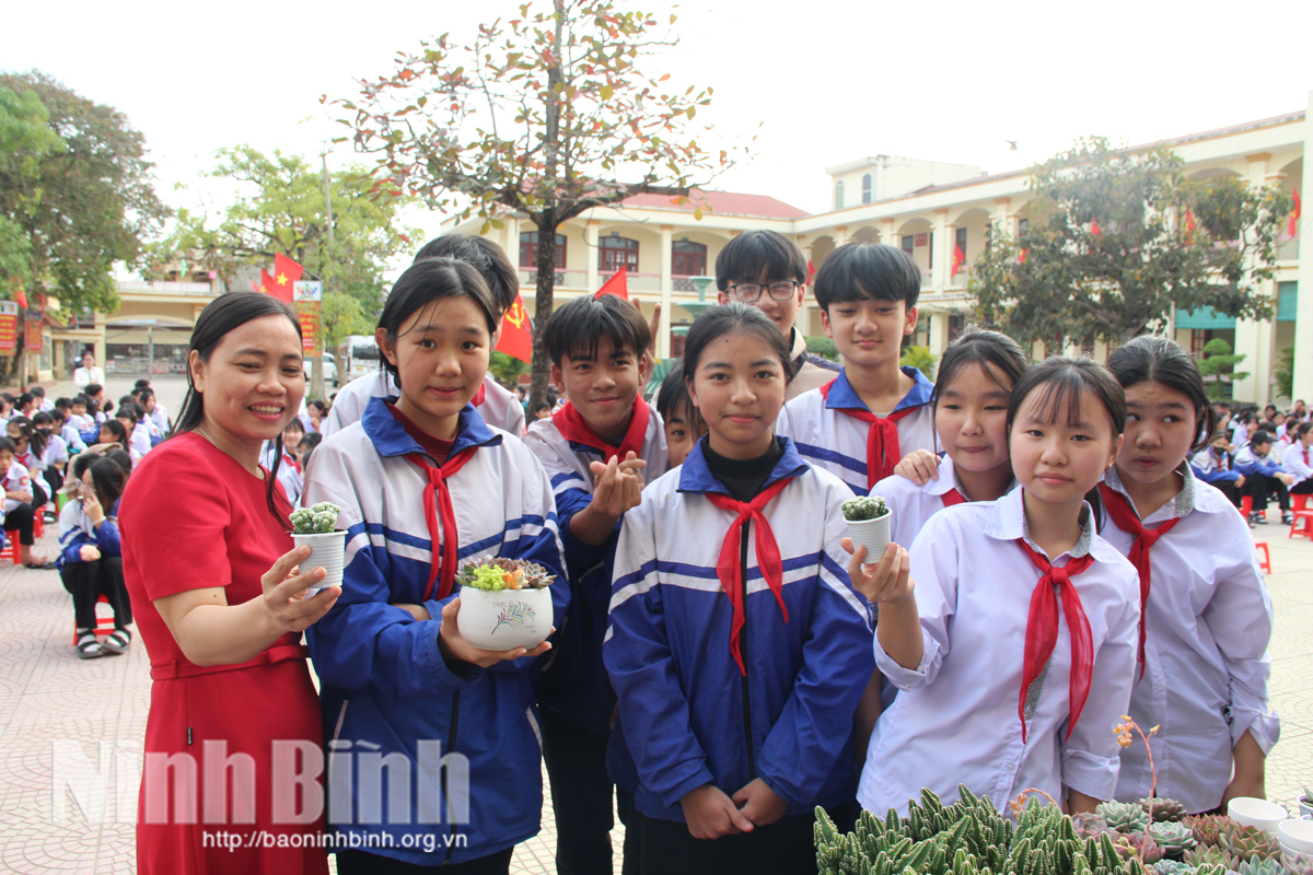 Giáo viên và học sinh Trường THCS Bắc Lý hào hứng tham gia việc làm đổi rác lấy cây.