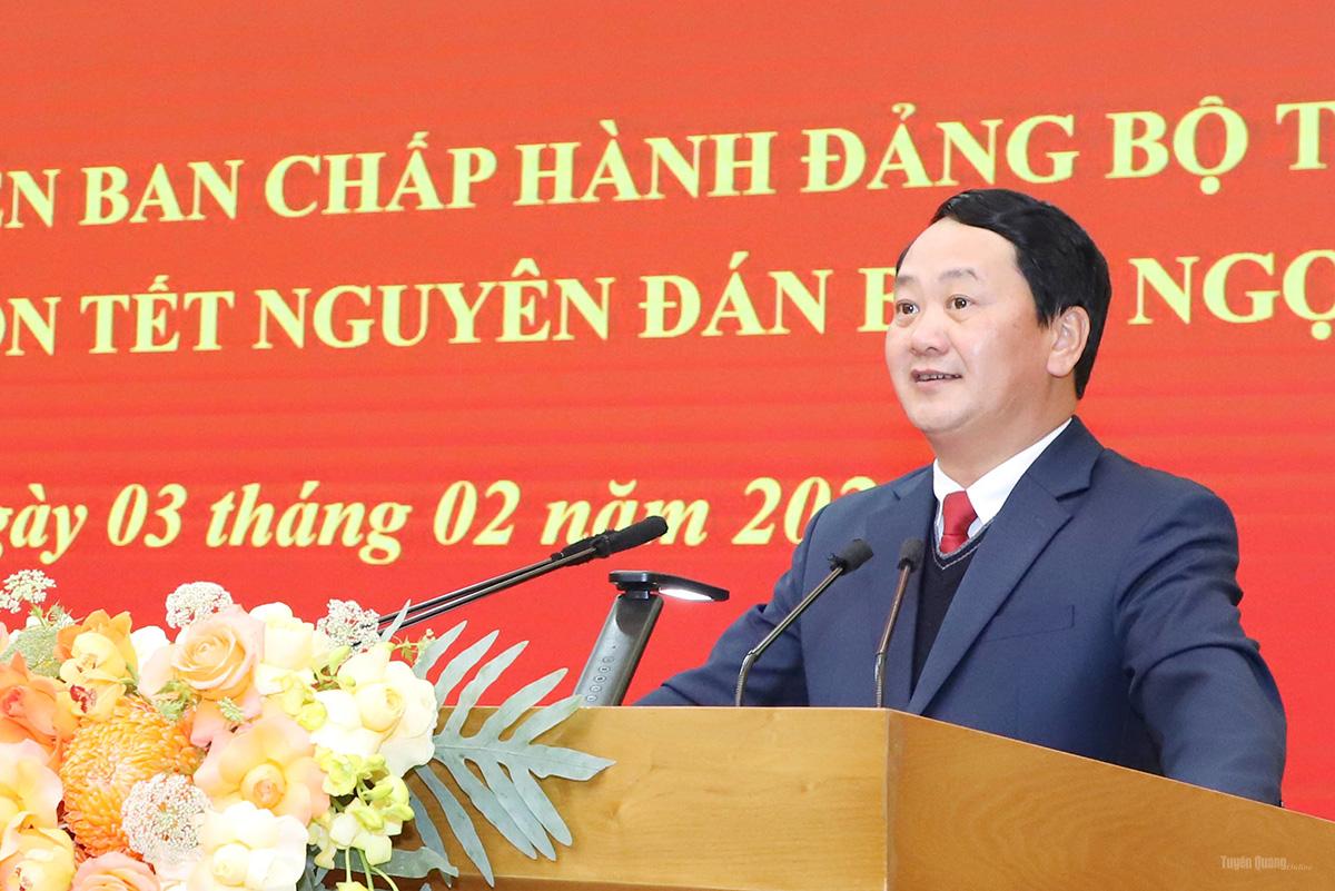 Phát biểu tại buổi gặp mặt, thay mặt Ban Chấp hành Đảng bộ tỉnh, Bí thư Tỉnh ủy Hầu A Lềnh đánh giá khái quát những thành tựu và định hướng phát triển của tỉnh với các nội dung: Năm 2025 là dấu mốc lịch sử đặc biệt. Tỉnh Tuyên Quang đã thực hiện thắng lợi chủ trương của Trung ương về hợp nhất, sắp xếp bộ máy, vận hành hiệu quả mô hình chính quyền địa phương hai cấp. Đặc biệt, việc tổ chức thành công Đại hội đại biểu Đảng bộ tỉnh lần thứ nhất, nhiệm kỳ 2025-2030 đã khẳng định sự thống nhất cao về ý chí và hành động, tạo tiền đề vững chắc cho giai đoạn phát triển mới.