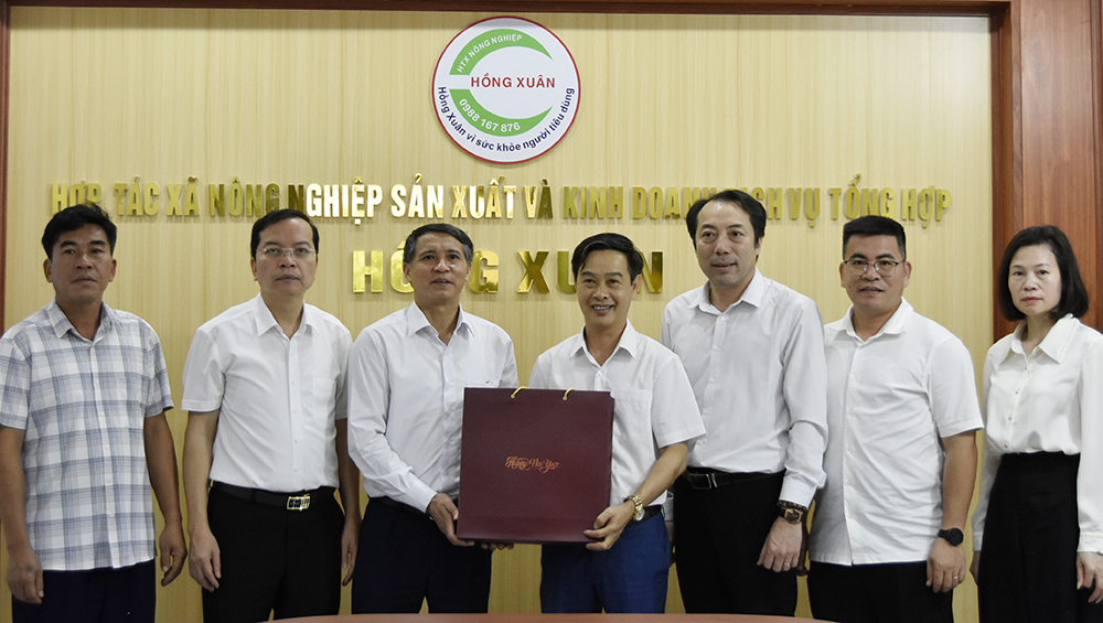 Lãnh đạo Ủy ban MTTQ và Liên minh Hợp tác xã tỉnh tặng quà động viên Hợp tác xã Nông nghiệp sản xuất và kinh doanh dịch vụ tổng hợp Hồng Xuân, phường Chũ.