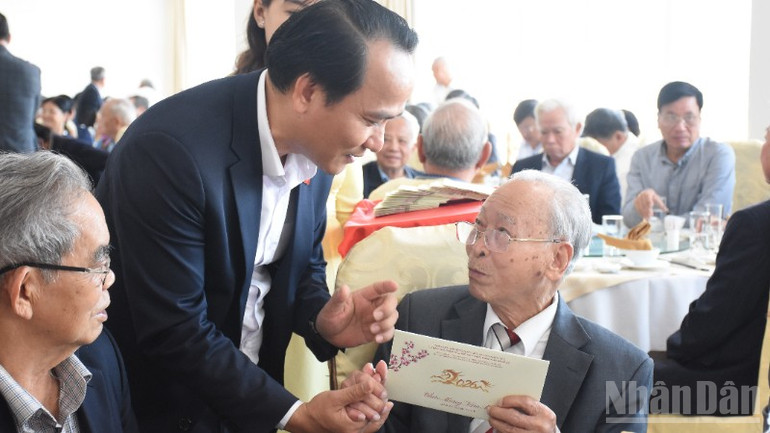 Phó Bí thư Thường trực Thành ủy Đà Nẵng Nguyễn Đình Vĩnh chúc tết đồng chí Lê Đào, 100 tuổi, nguyên Ủy viên Thường vụ Tỉnh ủy, Phó Chủ tịch Ủy ban nhân dân tỉnh Quảng Nam-Đà Nẵng cũ.