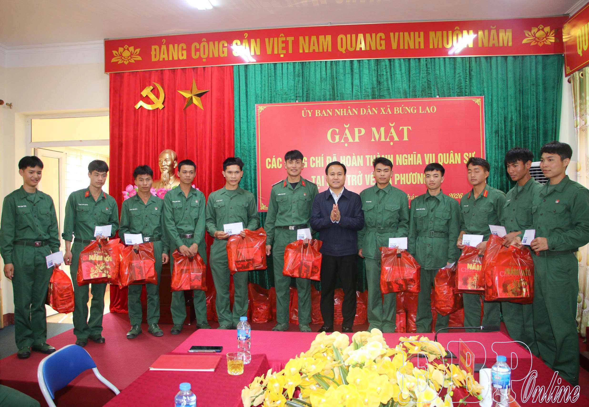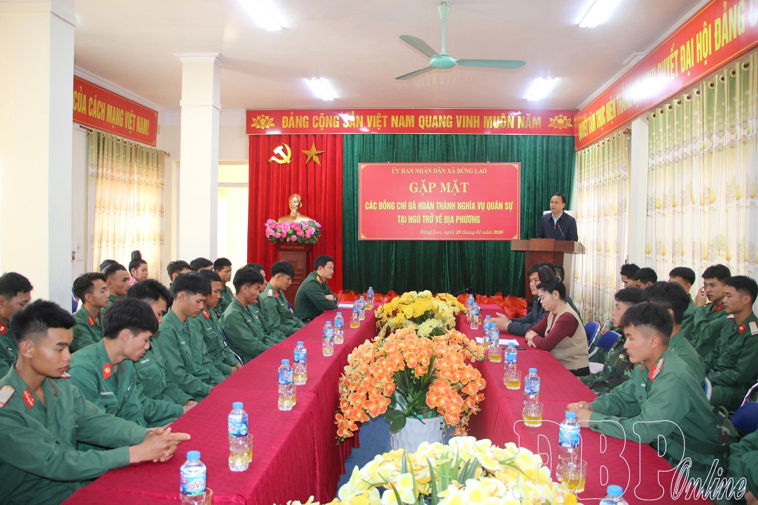 Trong không khí trang trọng, ấm áp, lãnh đạo UBND xã Búng Lao ghi nhận, biểu dương tinh thần trách nhiệm, ý thức tổ chức kỷ luật cùng những nỗ lực, cố gắng của 32 quân nhân trong thời gian học tập, rèn luyện và công tác tại các đơn vị quân đội. Trong suốt quá trình tại ngũ, các quân nhân luôn nêu cao ý chí, bản lĩnh, không quản ngại khó khăn, vất vả, hoàn thành tốt nhiệm vụ được Đảng, Nhà nước, Quân đội và Nhân dân giao phó.