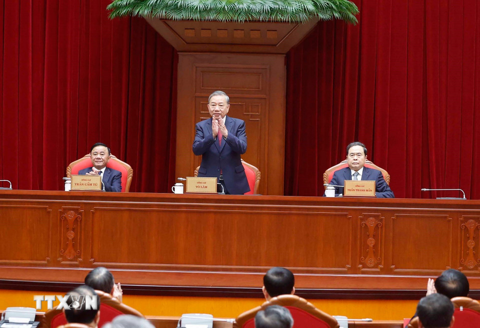 Tổng Bí thư Tô Lâm cùng Chủ tịch Quốc hội Trần Thanh Mẫn và Thường trực Ban Bí thư Trần Cẩm Tú đồng chủ trì cuộc gặp mặt. (Ảnh: Thống Nhất/TTXVN)