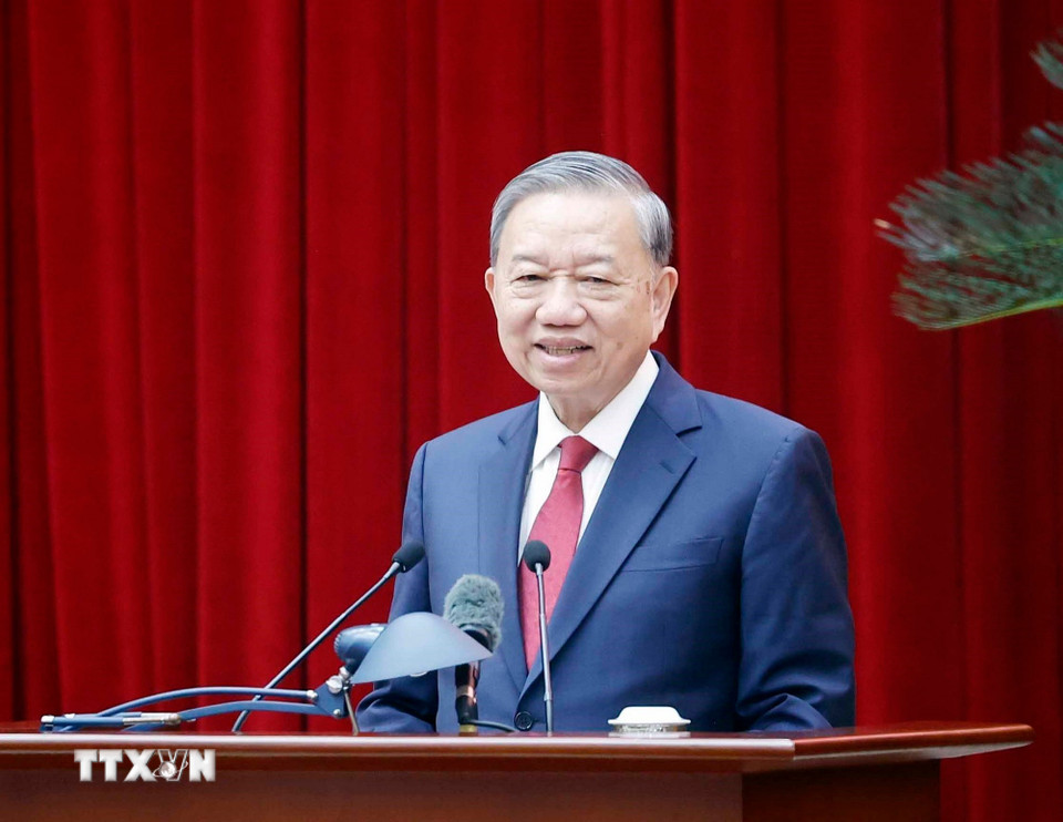 Tổng Bí thư Tô Lâm phát biểu tại cuộc gặp mặt thành viên Tiểu ban chuẩn bị Đại hội XIV của Đảng và Ban Chỉ đạo Tổng kết 40 năm đổi mới. (Ảnh: Thống Nhất/TTXVN)