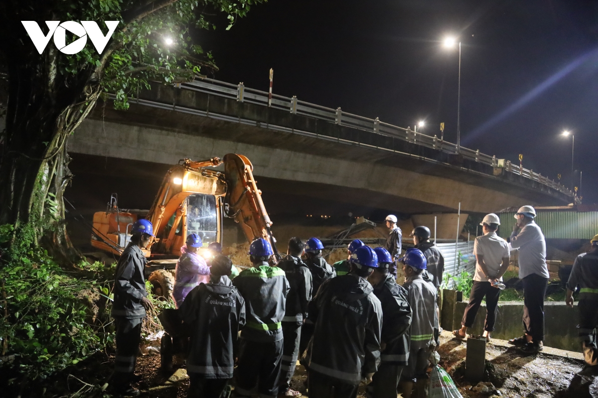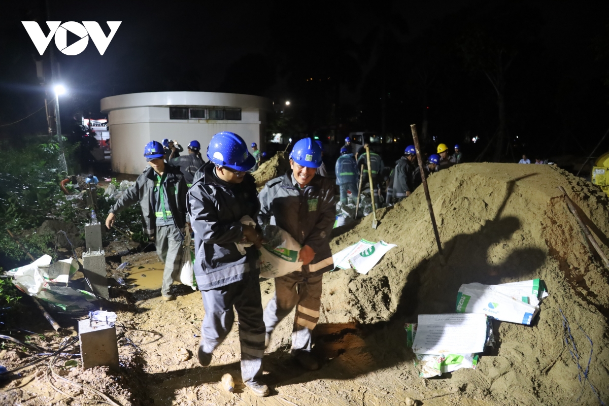 Tối ngày 29/10, hàng chục công nhân vẫn đang tiến hành bịt miệng cống tiêu tại khu vực vườn hoa Ba Tơ, phường Nghĩa Lộ, tỉnh Quảng Ngãi.
