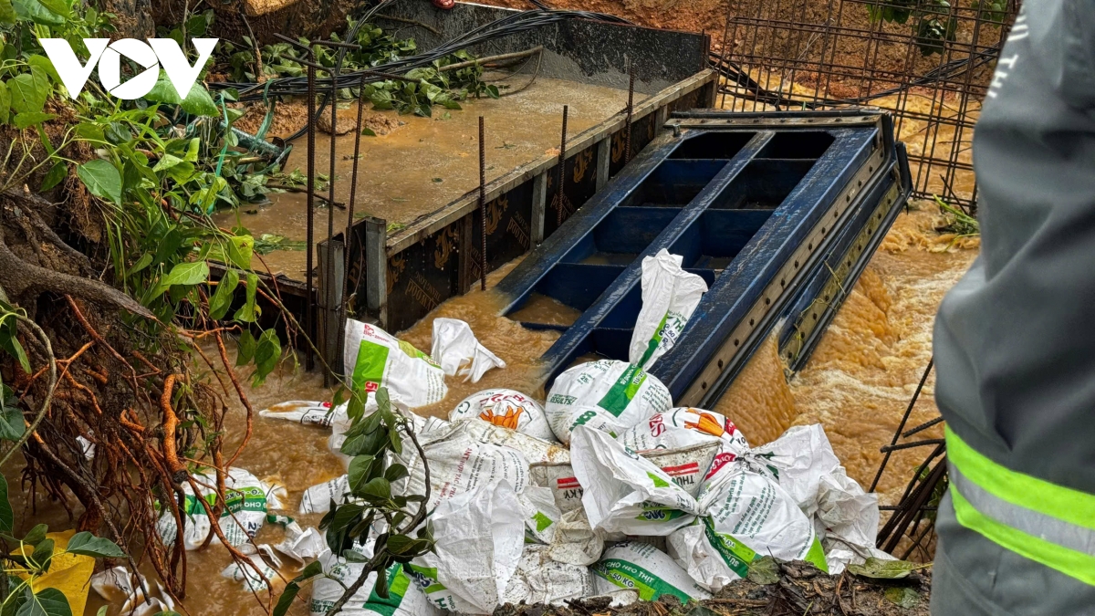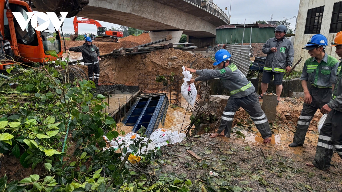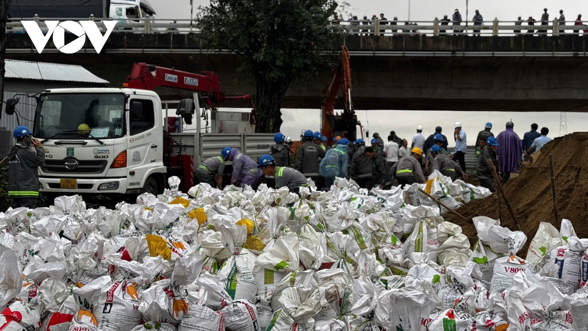 Lực lượng chức năng tỉnh Quảng Ngãi dùng bao cát, tấm sắt bịt miệng cống, đoạn cuối kênh Sông Đào (tiếp giáp với sông Trà Khúc, phường Nghĩa Lộ) để ngăn dòng nước chảy xiết tràn vào bên trong khu vực trung tâm hành chính của tỉnh.