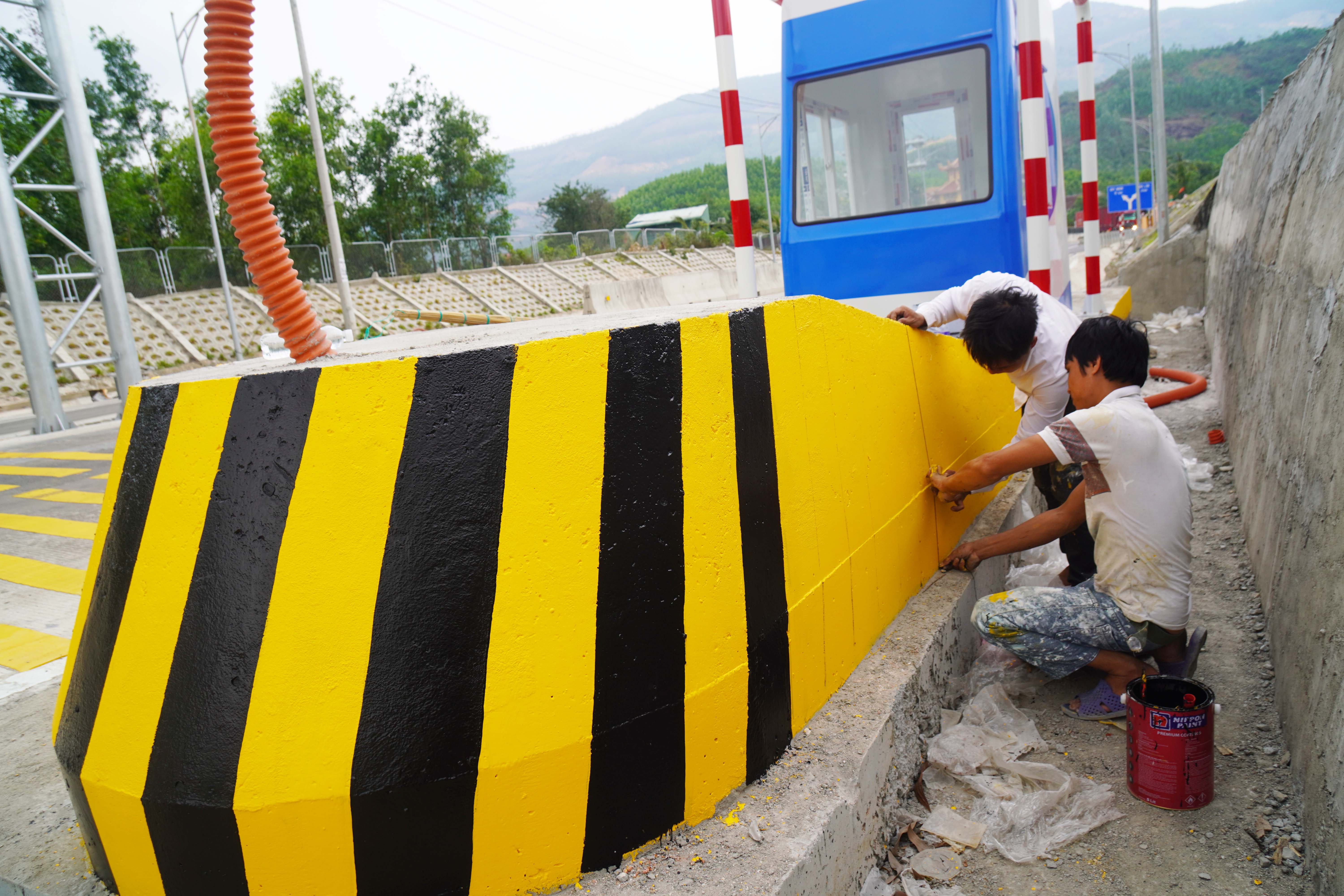Công nhân sơn hoàn thiện tại trạm kiểm soát thu phí ở nút giao quốc lộ 1 nhập làn cao tốc Bắc – Nam, phía Bắc hầm Cù Mông