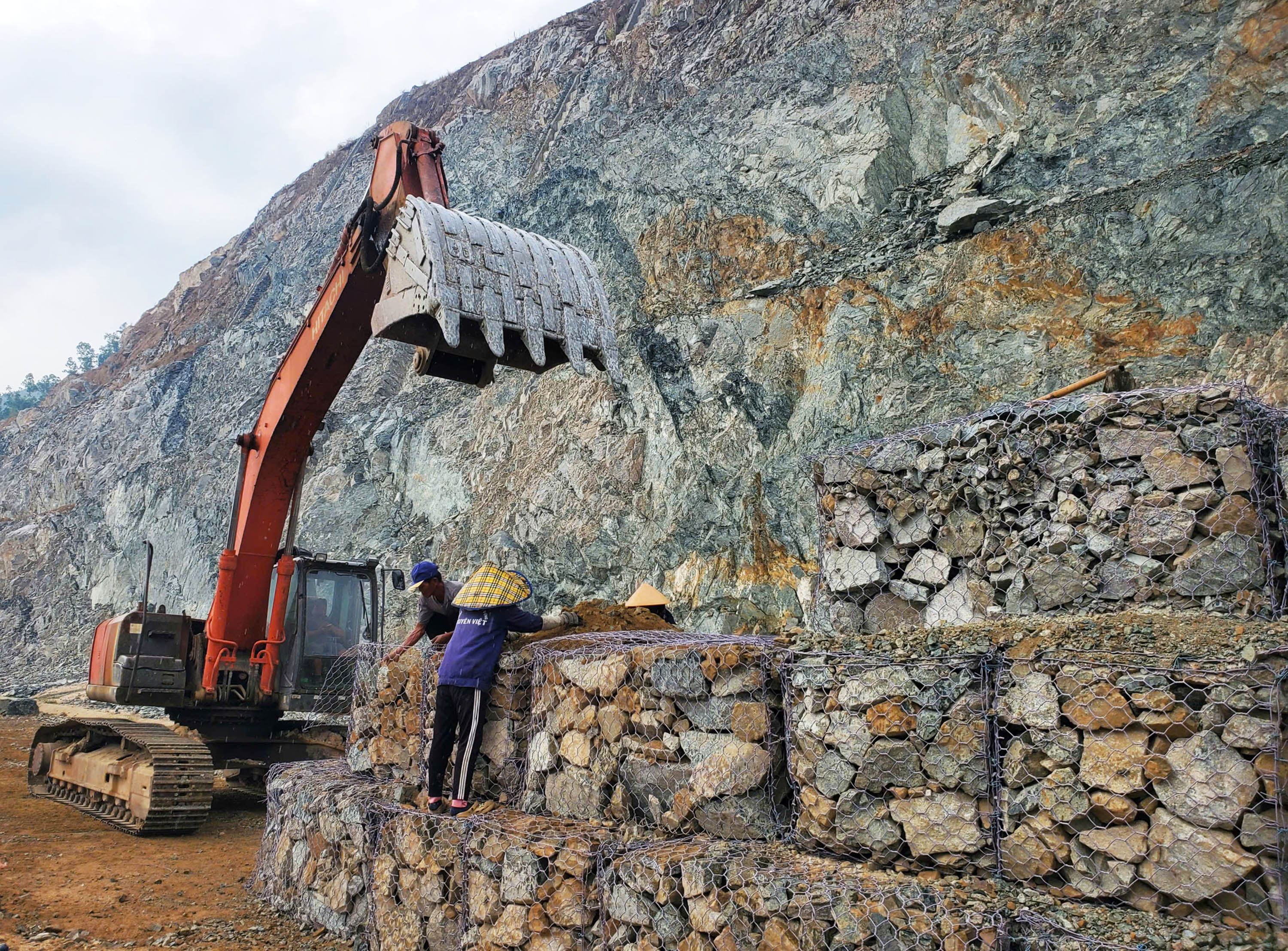 Công nhân gia cố mái taluy bằng rọ đá thép, phòng sạt lở tại tuyến cao tốc Bắc - Nam