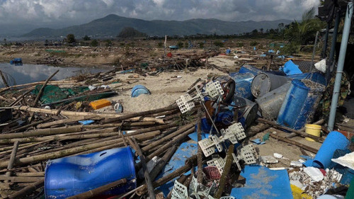 Lồng, bè nuôi tôm hùm của bà con phường Sông Cầu, tỉnh Đắk Lắk bị bão, sóng biển đánh dạt vào bờ, thiệt hại nặng nề cho người nuôi.