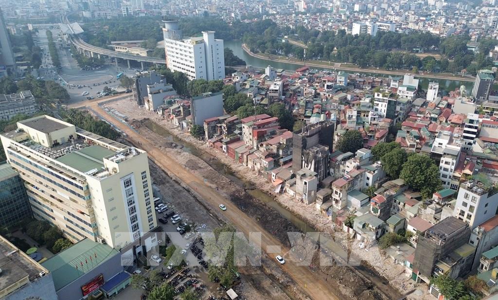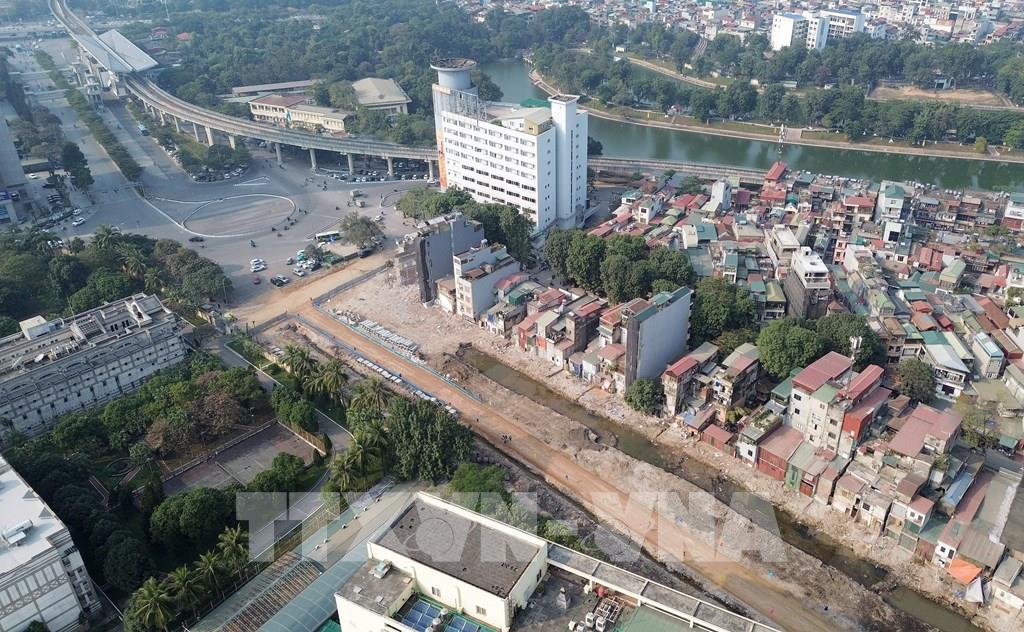 Dự án đường Vành đai 1 Hoàng Cầu – Voi Phục được thành phố Hà Nội triển khai hơn 10 năm nay với tổng mức đầu tư hơn 7.000 tỷ đồng; tuy nhiên dự án nhiều lần bị lỡ hẹn do vướng mắc mặt bằng, nguyên nhân có khoảng 300 hộ dân nằm trong phạm vi dự án chưa chấp thuận việc bàn giao nhà cửa, công trình xây dựng. Ảnh: Quốc Khánh - TTXVN