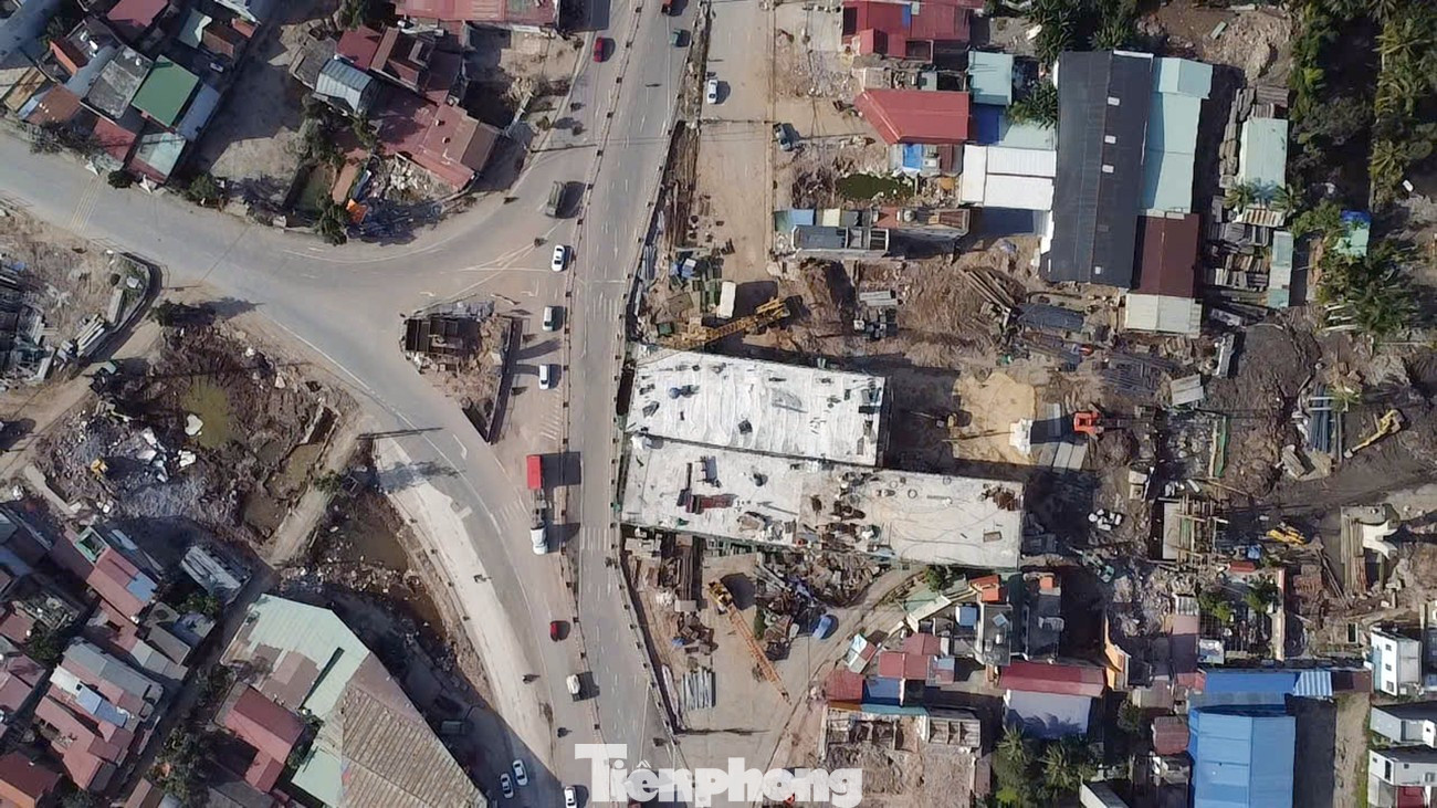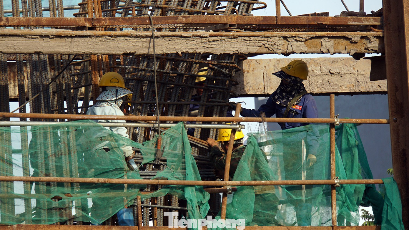 Công nhân thi công đường dẫn hướng từ đường Hưng Đạo lên cầu Hải Thành. Khu vực này có nền đường Hưng Đạo cũ và phần mở rộng với tổng mặt cắt ngang rộng 68m. Đơn vị thi công dựng rào, căng dây phản quang cảnh báo các phương tiện khi di chuyển tới gần công trường.