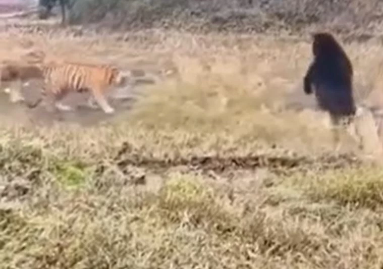 Trong clip, con gấu đang đứng gần một hố nước thì bất ngờ có một con hổ tiến đến. Khi kẻ săn mồi cố gắng tiếp cận, gấu đen lập tức đứng thẳng người, đối mặt trực diện mà không hề tỏ ra sợ hãi. Cuộc đấu mắt căng thẳng chỉ kéo dài vài giây trước khi gấu đen gầm lên, khiến con hổ phải lùi lại rồi bỏ chạy.