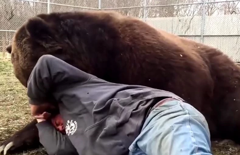 Trong clip, một con gấu khổng lồ đè người đàn ông xuống đất, dùng hai chân trước ôm trọn cơ thể đối phương. Không chỉ vậy, con vật còn liên tục cắn vào áo và phần đầu người đàn ông, khiến người xem dễ lầm tưởng đây là một cuộc tấn công dữ dội.