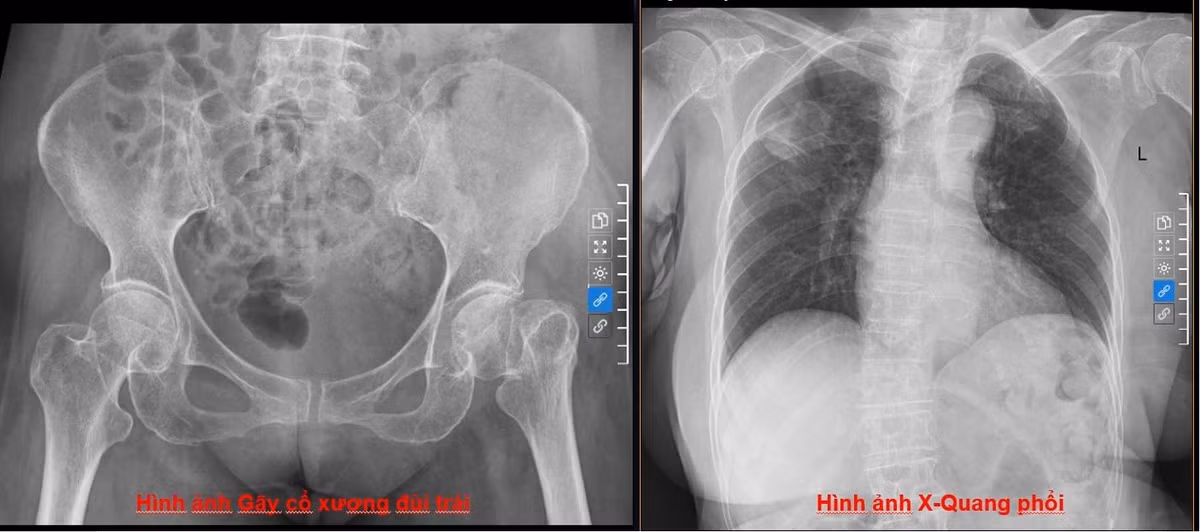Hình ảnh phim chụp X-Quang gãy cổ xương đùi trái và chụp X-Quang phổi của bệnh nhân