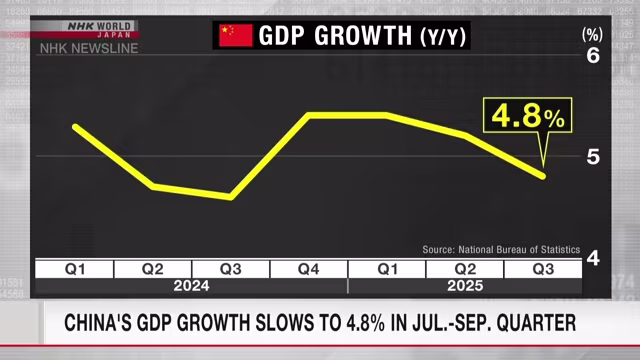 Cục Thống kê Quốc gia Trung Quốc mới đây cho biết, tổng sản phẩm quốc nội (GDP) sau khi điều chỉnh lạm phát, đã tăng 4,8% so với cùng quý năm ngoái. Con số này giảm so với mức tăng 5,2% của quý từ tháng 4 đến tháng 6 năm nay.