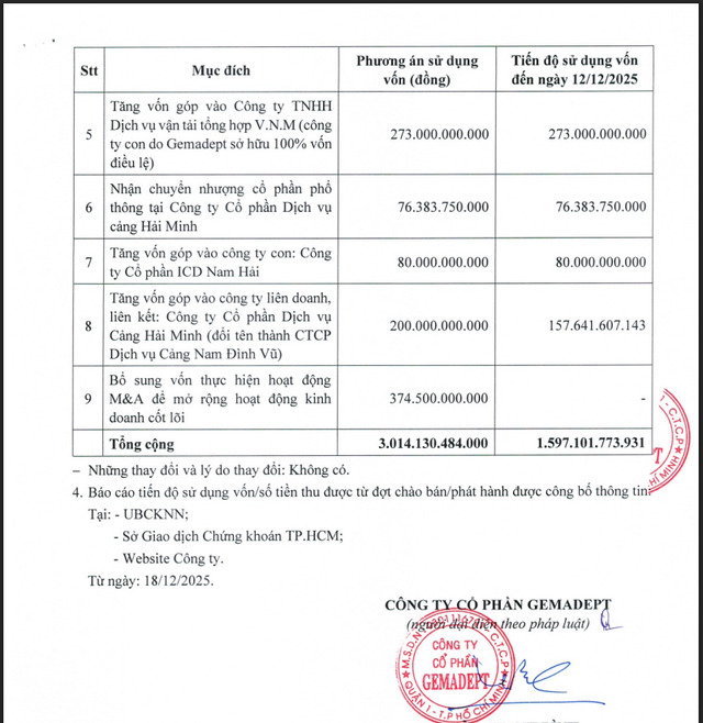 Theo đó, tính đến ngày 12/12/2025, Gemadept đã giải ngân tổngsố tiền hơn 1.597 tỷ đồng, còn lại hơn 1.417 tỷ đồng chưa được giải ngân.