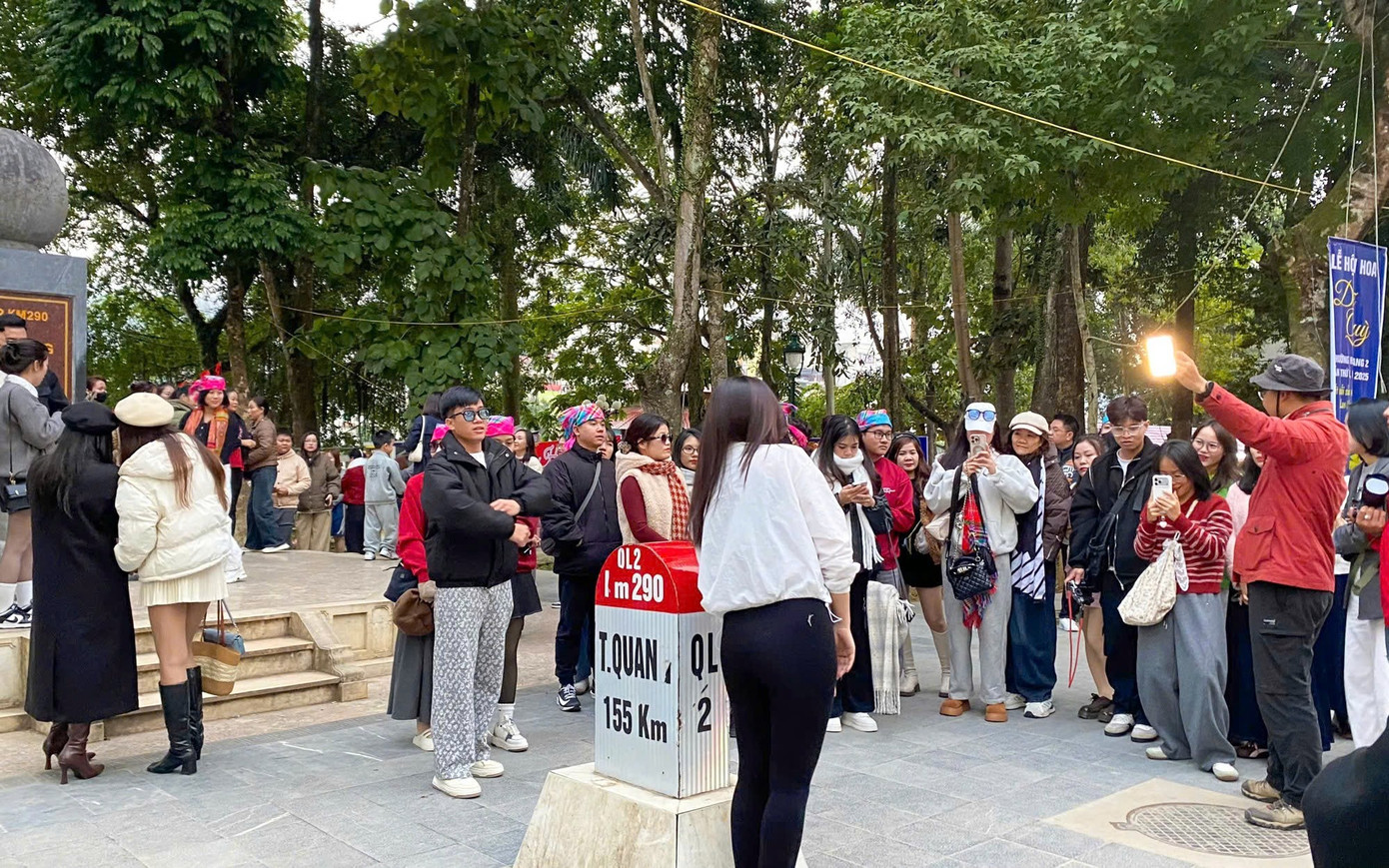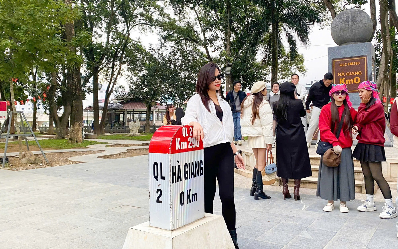 Đông đảo các bạn trẻ, du khách xếp hàng check-in với cột mốc Km0 Hà Giang.
