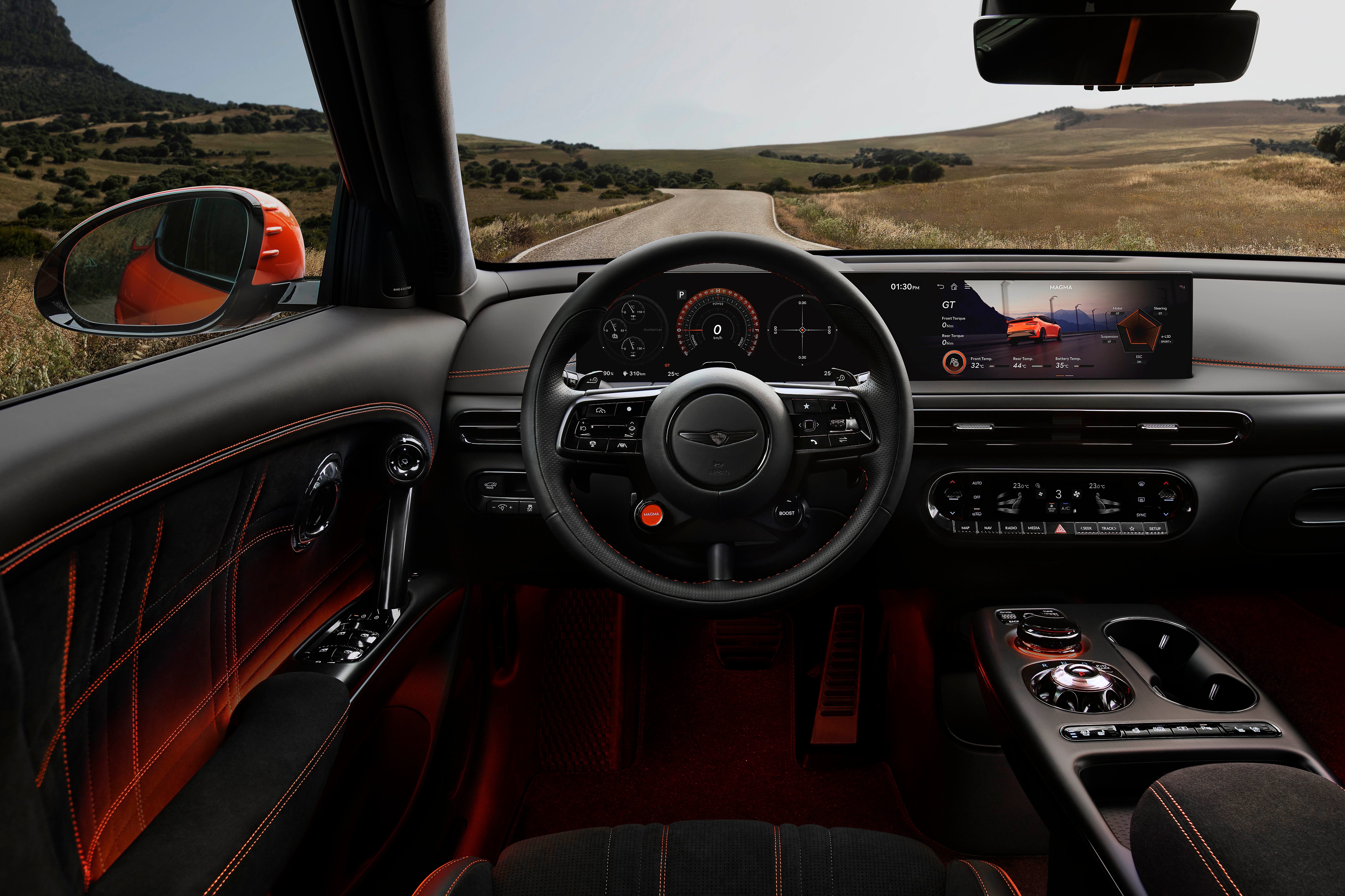 Genesis GV60 Magma được nâng cấp với vô lăng tích hợp nút tăng cường hiệu năng và chế độ lái. Bảng đồng hồ taplo và màn hình sở hữu giao diện đặc trưng của Magma.