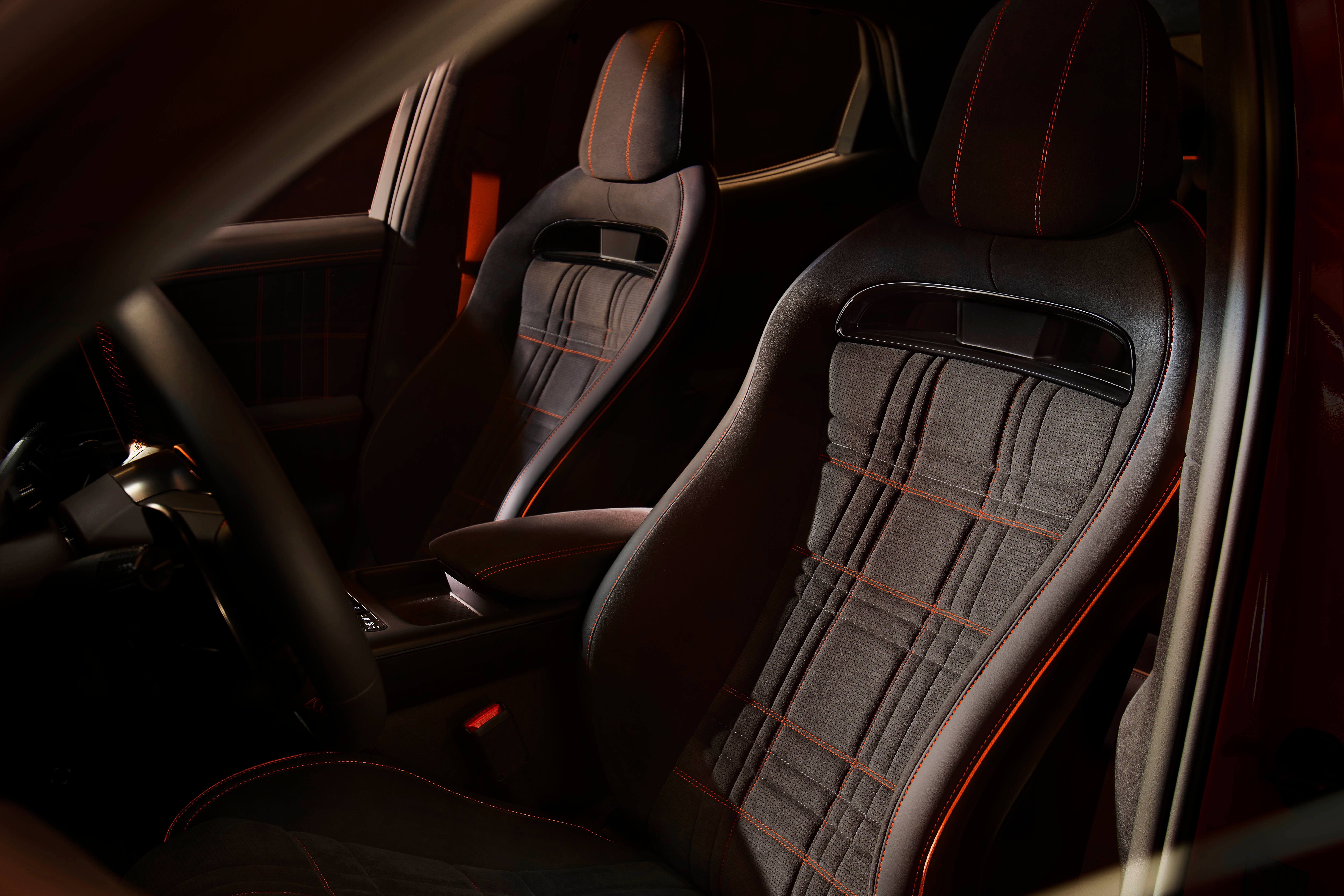 Ghế thể thao, tapi cửa hay bệ tay trung tâm được bọc chất liệu Chamude tương tự da lộn, kết hợp các chi tiết chỉ khâu màu cam và xám tạo điểm nhấn thể thao.