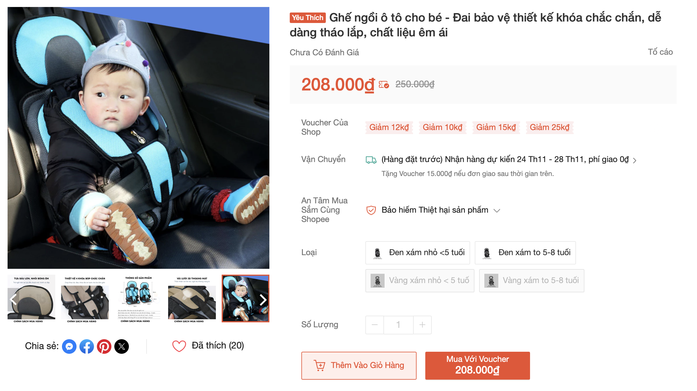 Ví dụ một trong những sản phẩm phổ biến trên sàn thương mại là đai cố định 5 điểm bằng vải có giá khoảng 300.000 đồng, được trang trí bằng các họa tiết hình thú cưng. Các mẫu đai, ghế an toàn này chủ yếu sử dụng vật liệu mềm như vải và mút xốp thông thường.