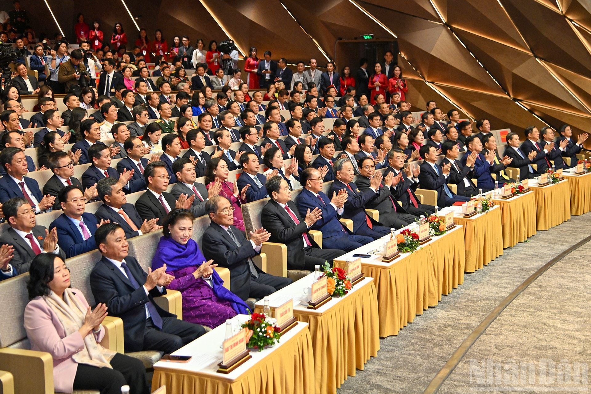 Tổng Bí thư Tô Lâm cùng các đồng chí lãnh đạo, nguyên lãnh đạo Đảng, Nhà nước và đại biểu tham dự buổi lễ (Ảnh: Báo Nhân Dân)
