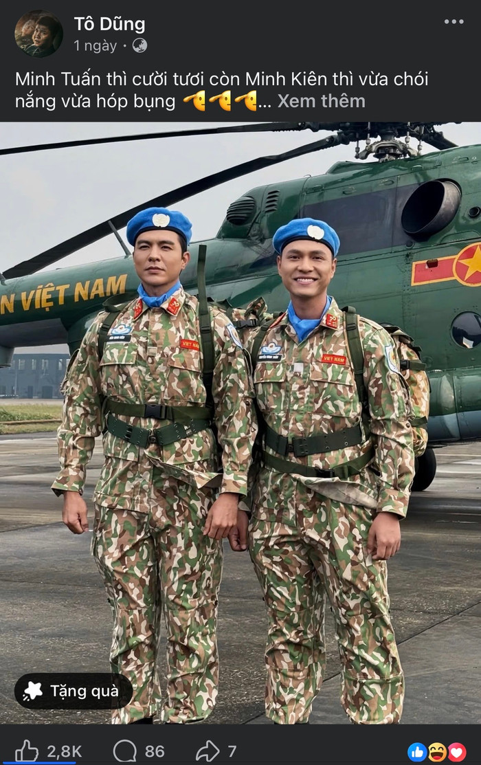 Trên trang cá nhân, diễn viên Tô Dũng vừa có dòng chia sẻ khiến người hâm mộ không khỏi nhịn cười: "Minh Tuấn thì cười tươi còn Minh Kiên thì vừa chói nắng vừa hóp bụng". Trong khi Minh Tuấn (do Tô Dũng thủ vai) sở hữu nụ cười rạng rỡ, thì Minh Kiên (Steven Nguyễn) lại có biểu cảm khá "nghiêm trọng" dưới cái nắng gắt của trường quay.