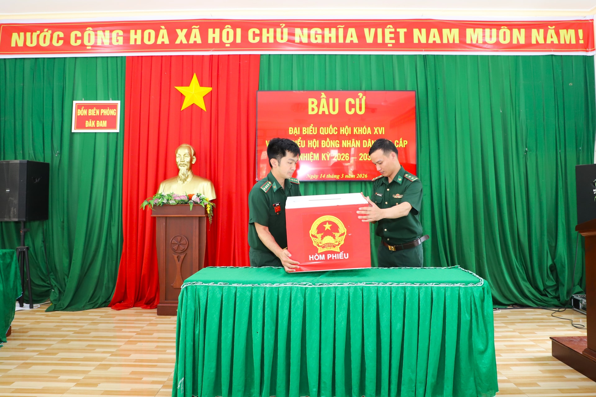Chuẩn bị hòm phiếu và cơ sở vật chất phục vụ khu vực bỏ phiếu tại Đồn Biên phòng Đắk Đam