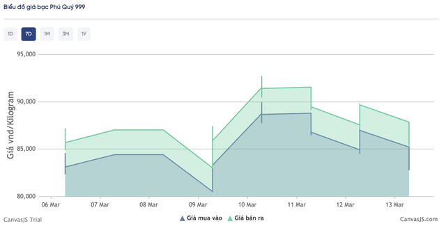 Biểu đồ giá bạc hôm nay của hệ thống Phú Quý ghi nhận xu hướng bạc trong 7 ngày qua.