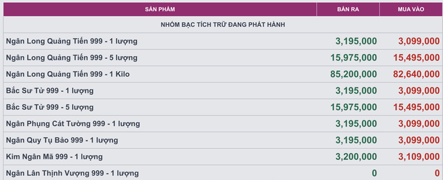 Ở chiều bán ra, Sacombank-SBJ vẫn là thương hiệu niêm yết cao hơn so với nhiều hệ thống khác. Đầu giờ chiều nay, giá bạc của đơn vị này được ghi nhận ở mức khoảng 87,6 triệu đồng/kg, tương đương 3,285 triệu đồng/lượng.