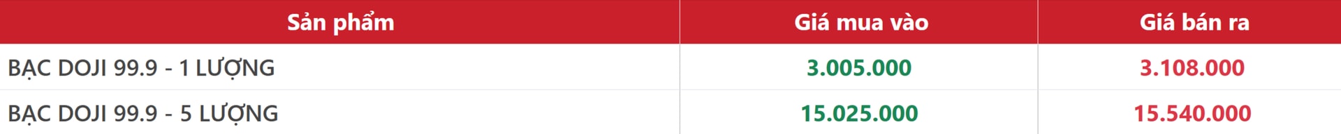 Bạc DOJI 99.9 loại 1 lượng được niêm yết ở mức 3,005 – 3,108 triệu đồng/lượng, chênh lệch 103.000 đồng/lượng. Giá tăng 3.000 đồng/lượng ở chiều mua vào nhưng giảm 27.000 đồng/lượng ở chiều bán ra so với hôm qua.
