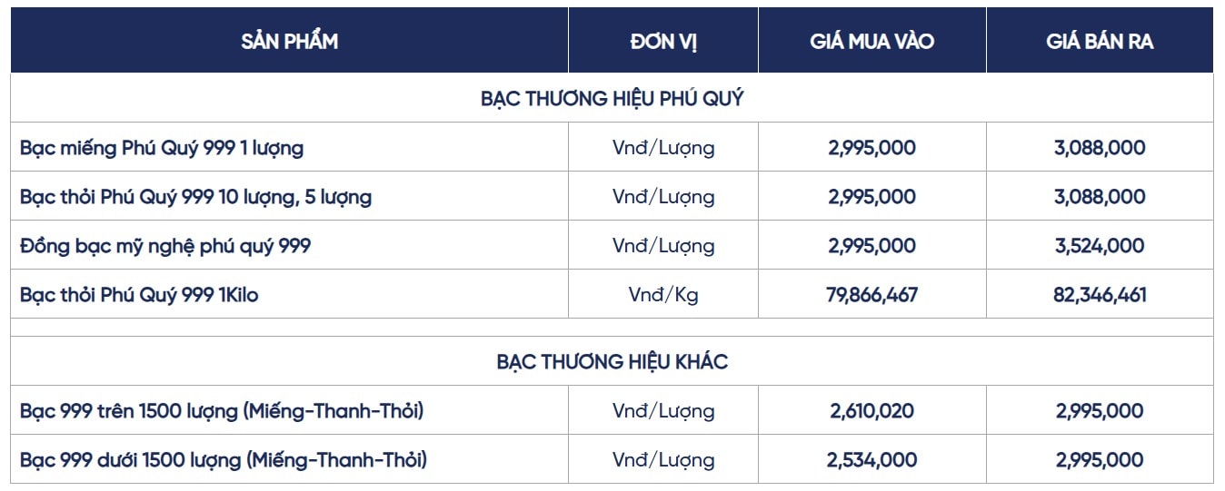 Bạc thỏi Phú Quý 999 loại 1 kg được niêm yết ở mức 79,87 – 82,35 triệu đồng/kg, chênh lệch 2,48 triệu đồng/kg. Giá giảm khoảng 720.000 đồng/kg ở chiều mua vào và 720.000 đồng/kg ở chiều bán ra so với hôm qua.