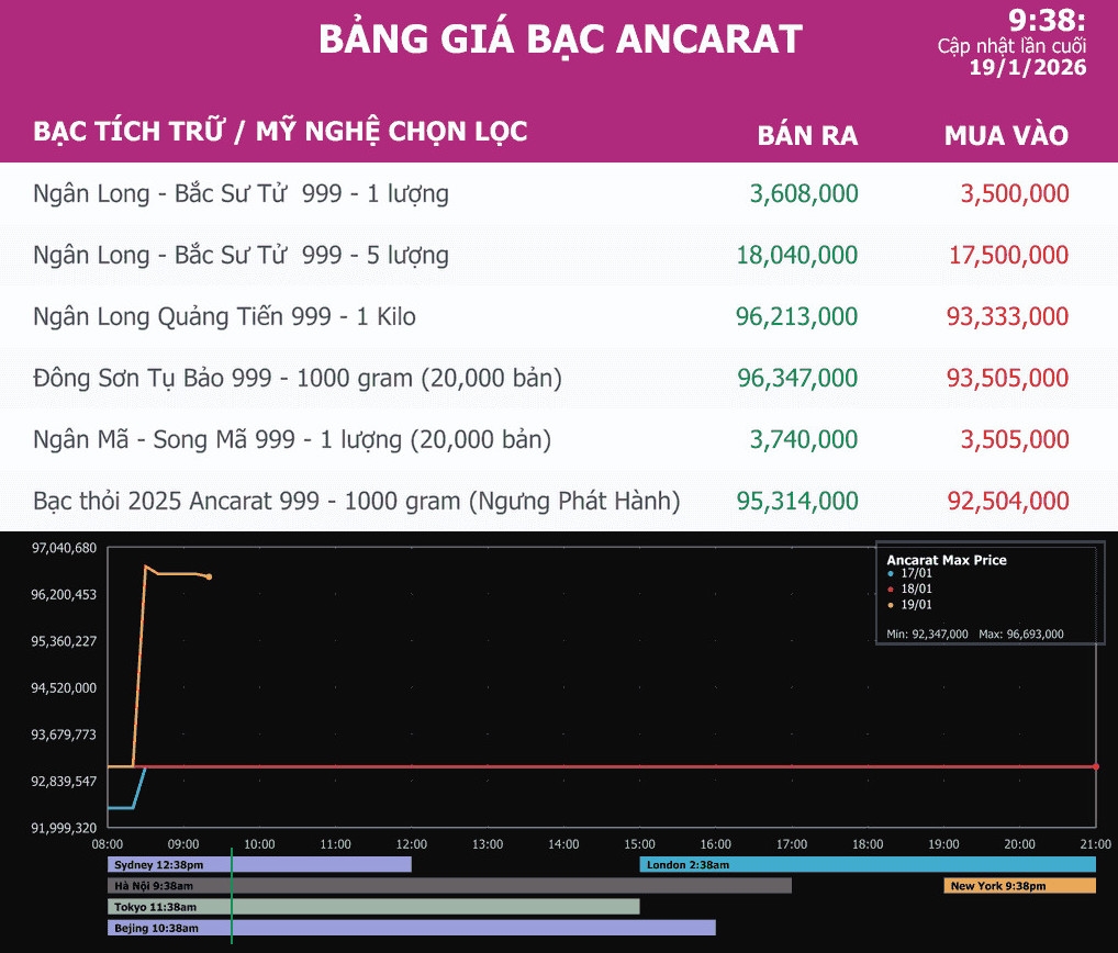 Công ty Kim Loại Quý Ancarat niêm yết giá bạc thỏi Ancarat 999 (1kg) là 93,44 - 96,34 triệu đồng/kg (mua vào và bán ra) tăng 2,51 triệu đồng/kg ở chiều mua vào và tăng 2,58 triệu đồng/kg ở chiều bán ra so với chốt phiên giao dịch trước.