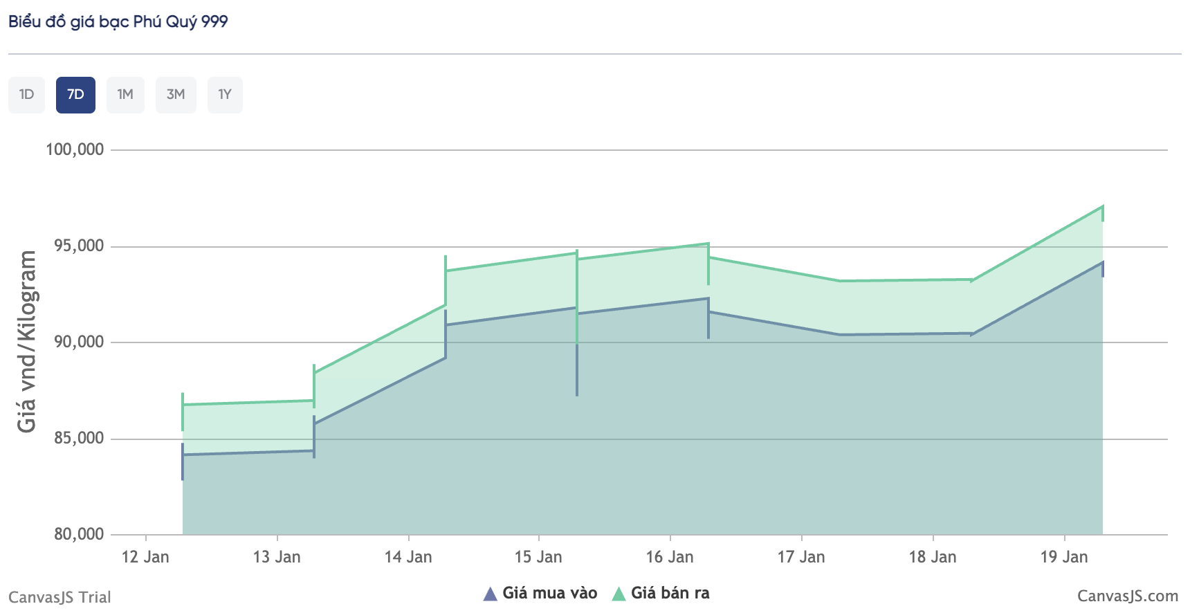 Biểu đồ giá bạc của hệ thống Phú Quý trong 7 ngày qua.