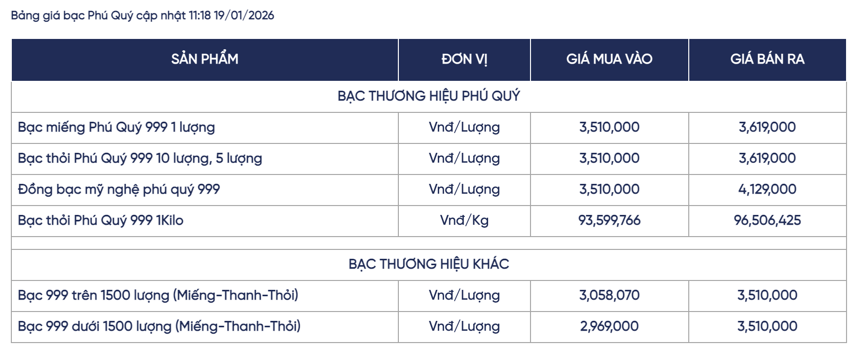 Giá bạc của hệ thống Ancarat tại nhịp điều chỉnh trưa ngày 19/1.