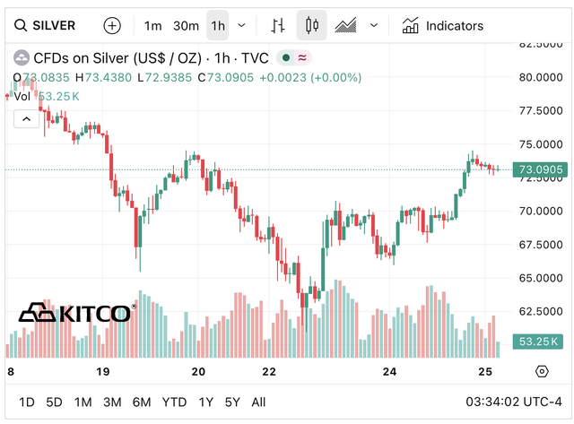 Trên thị trường quốc tế, đến thời điểm 14h48 phút theo giờ Việt Nam, giá bạc giao ngay ghi nhận đang ở vùng 73 USD/oz, cho thấy, sự hồi phục rõ rệt sau giai đoạn giảm mạnh trước đó, với cấu trúc đáy sau cao hơn đáy trước, phản ánh lực mua đã quay trở lại.