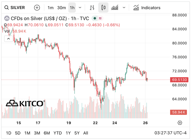 Trên thị trường quốc tế, giá bạc giao ngay đang lùi về vùng 69 USD/oz – mức thấp hơn đáng kể so với các phiên trước. Diễn biến này cho thấy xu hướng giảm vẫn chiếm ưu thế khi các nhịp hồi kỹ thuật gần đây đều yếu và nhanh chóng bị bán xuống.