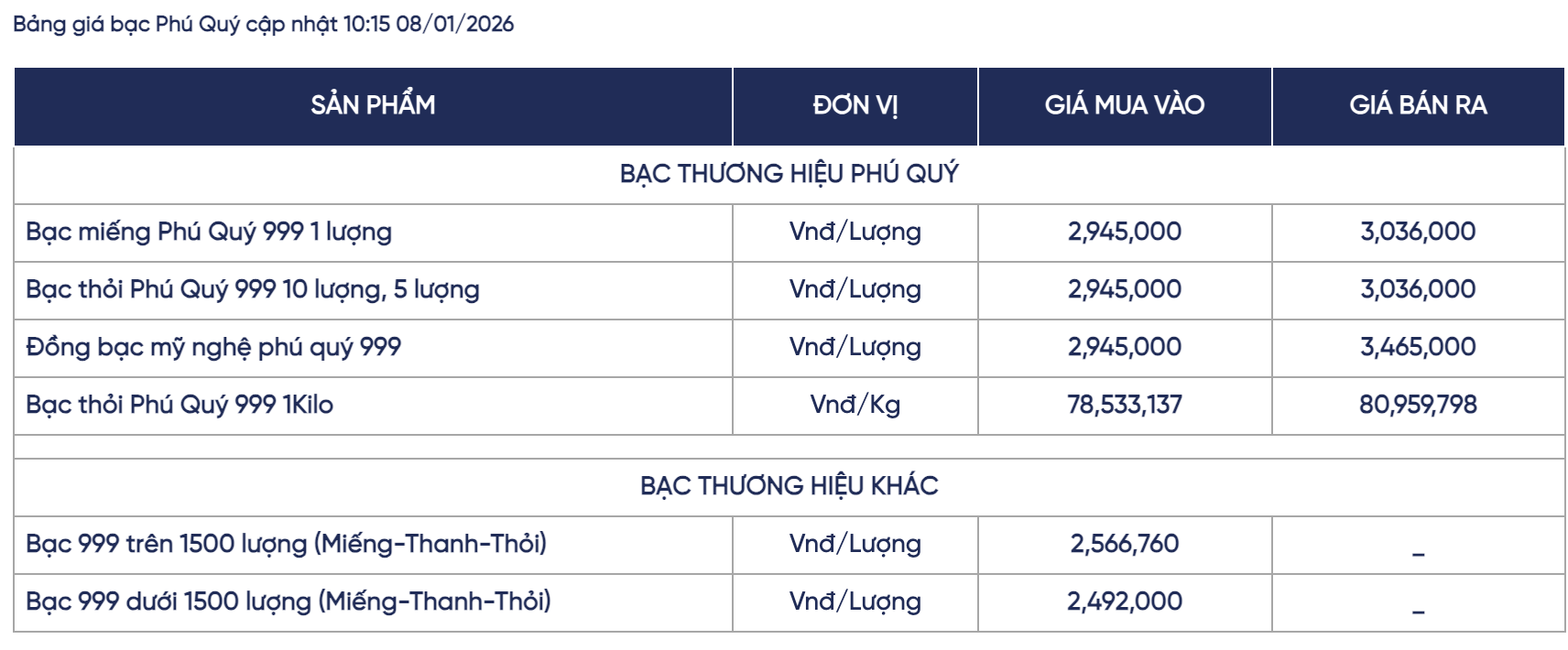 Bảng giá bạc của Phú Quý tại nhịp điều chỉnh lúc 10h15 phút hôm nay.